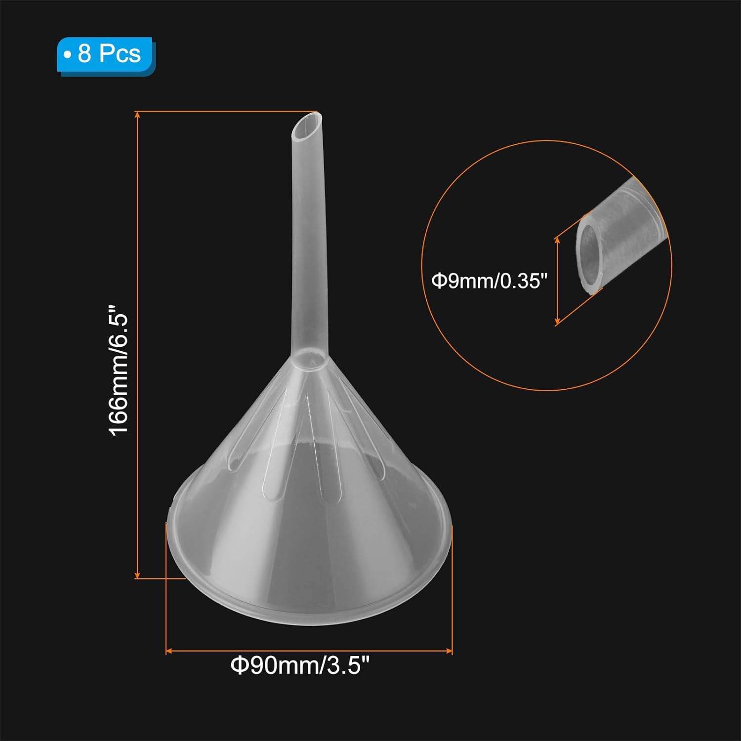 - Color: Clear; Material: PP Plastic; Top Opening Dia: 90mm / 3.5 inch; Outlet Dia: 9mm / 0.35 inch; Length: 166mm / 6.5 inch; Packing List: 8 x Clear Plastic Funnel