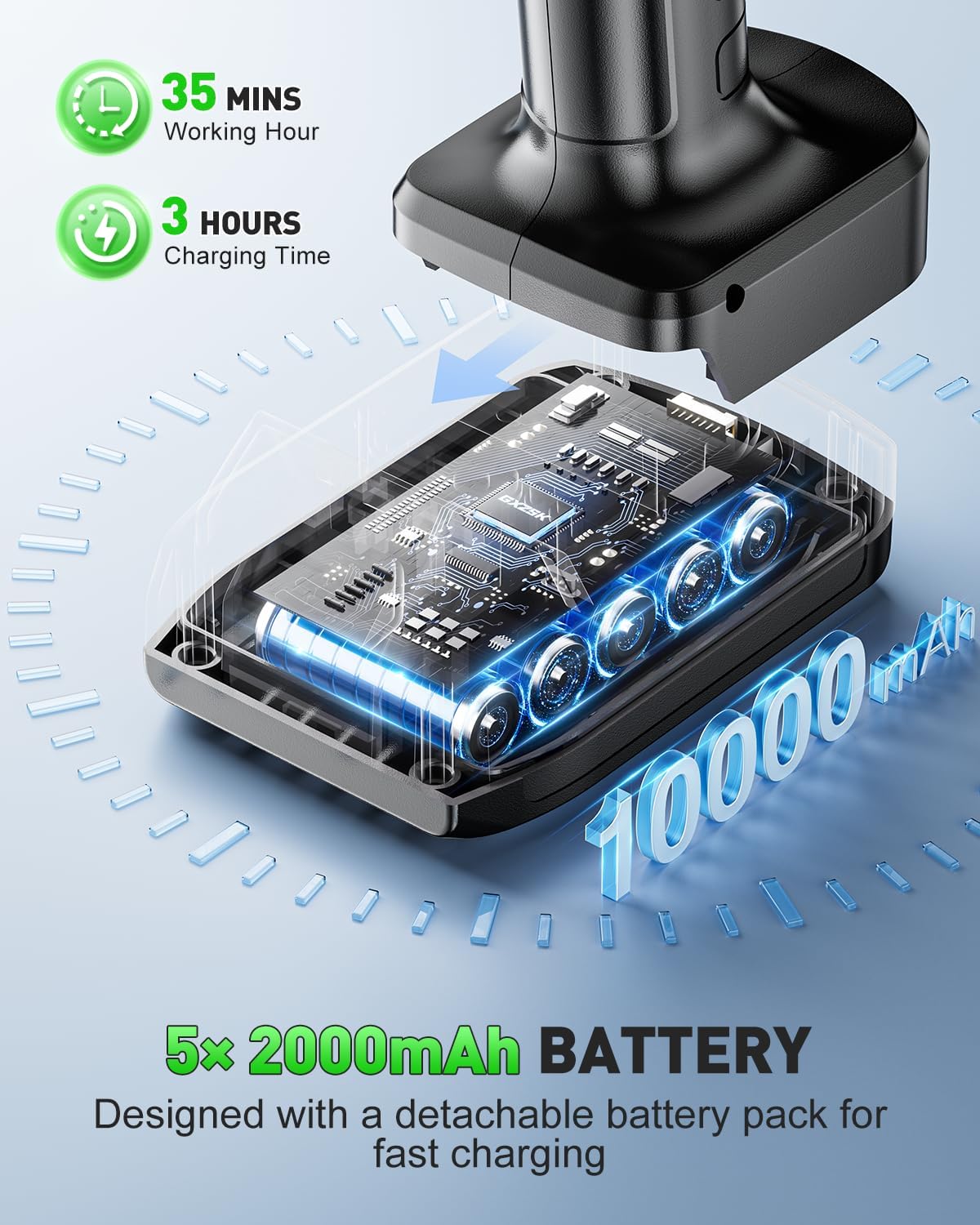 - 🔋【35-Minute Runtime】This rechargeable hand vacuum is equipped with an upgraded detachable battery design, boasting a high battery capacity of up to 10000mAh, capable of running continuously for as long as 35 minutes. Additionally,the hand vacuum is equipped with a stable 21V 0.5A charging adapter. Its advanced battery design fully meets your long-term usage needs, and is the preferred choice for efficient cleaning operations