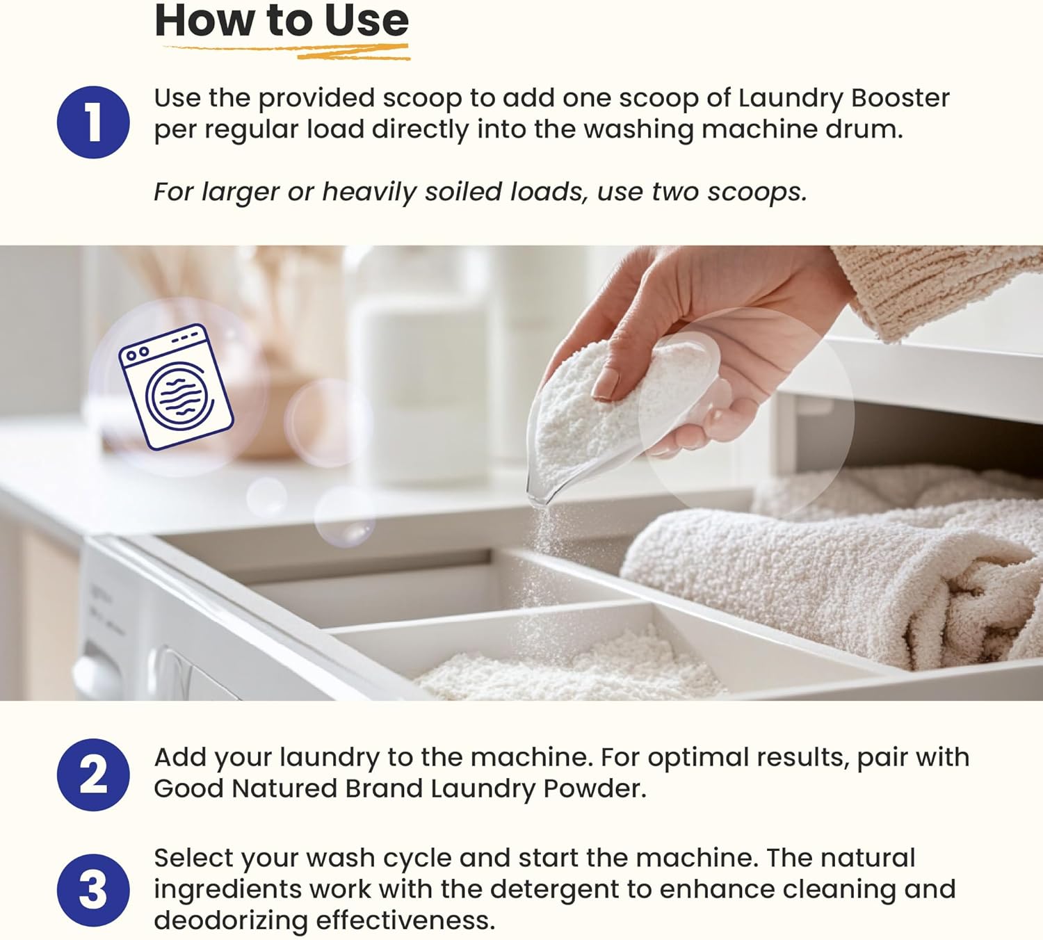 - How To Use: Add one scoop directly into the washing machine drum for a regular load, using the provided scoop. For larger or heavily soiled loads, use two scoops. Add your laundry to the machine. For best results, pair with Good Natured Brand Laundry Powder. Choose your wash cycle and start the machine.