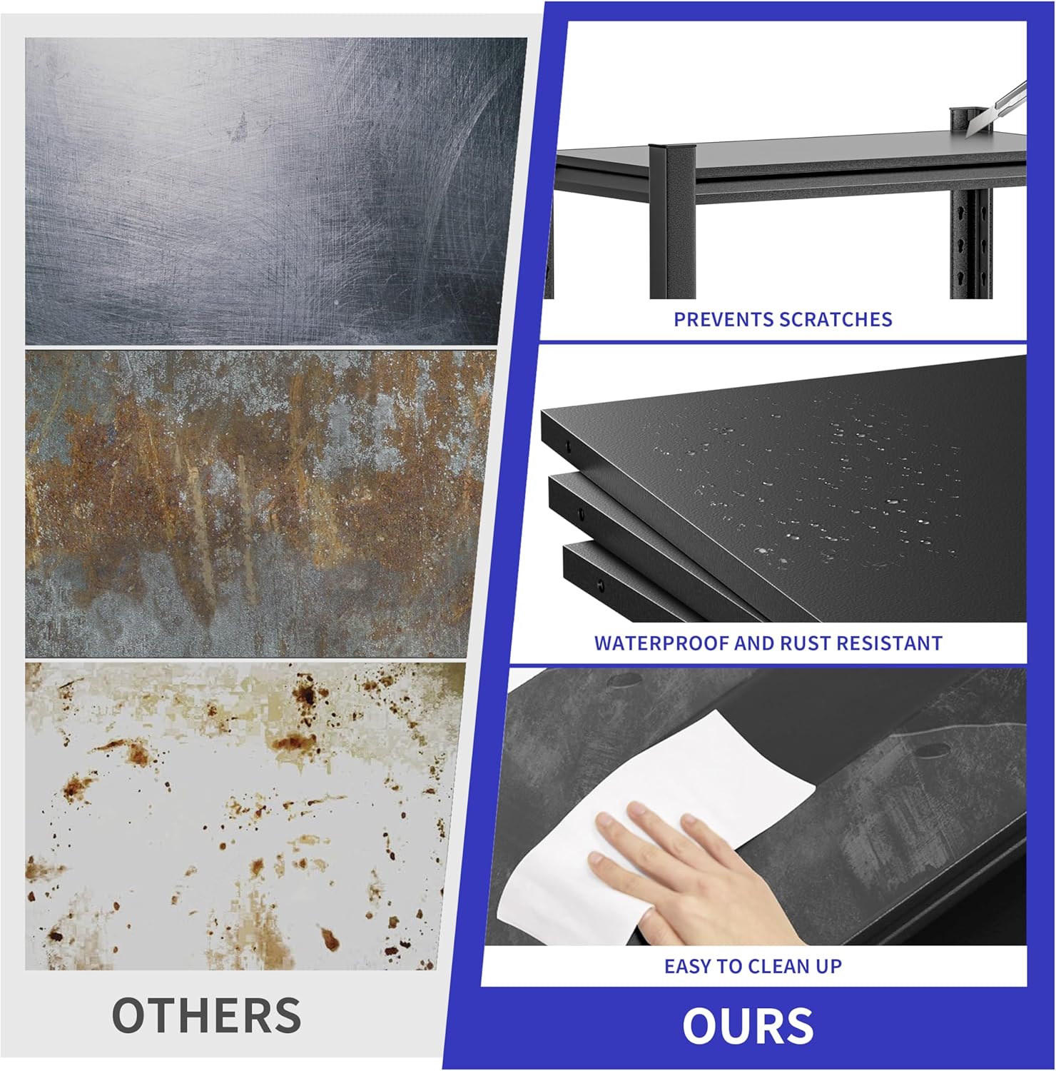 - 【RUST-PROOF, SCRATCH-PROOF, EASY-TO-CLEAN HEAVY DUTY SHELF】The garage shelving is treated with anti-rust spray paint, the metal material and special surface treatment can prevent the rust problem caused by the humid environment; the smooth metal surface design makes this shelf very easy to clean and take care of daily. Each shelf is equipped with protective pads to protect floors from damage.
