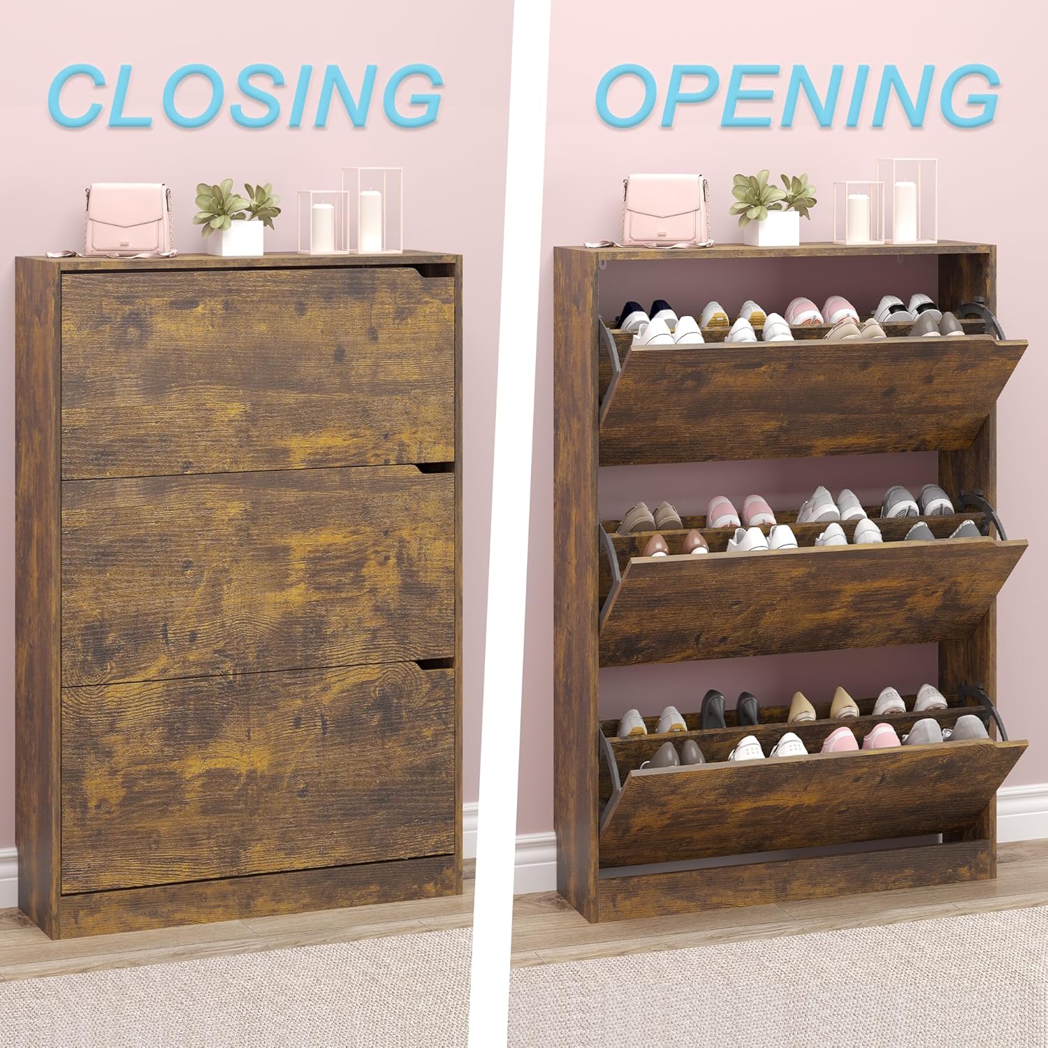 - 【Adjustable panel shoe cabinet】:The 3 flip drawers,There are two upper and lower drawers, each drawer contains 2 tiers of storage space. The panel can be adjusted or removed in two grooves to accommodate different heights and sizes of flats, mid boots or heels! on the top, ideal for placing potted plants, ornaments, socks and keys.