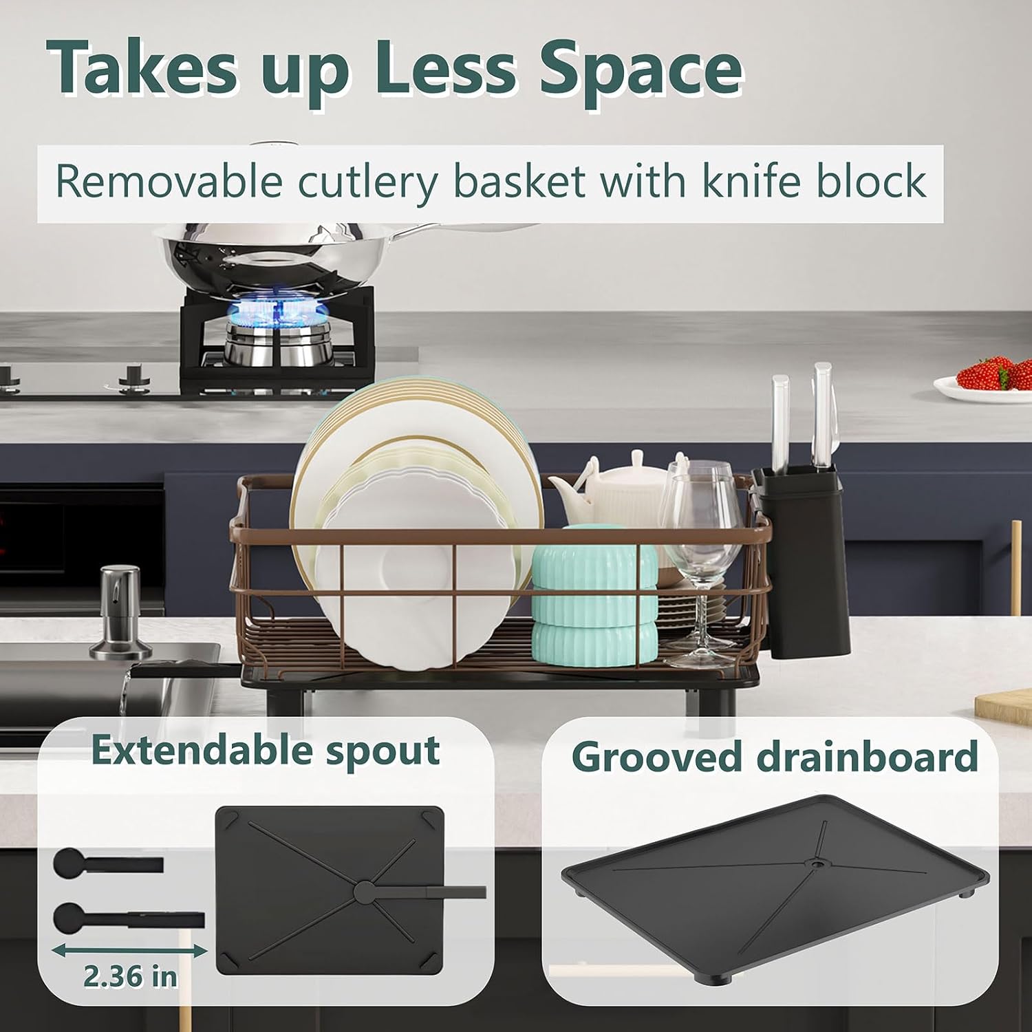 Iron Dish Drying Rack with Drainboard Dish Drainers for Kitchen Counter Extendable Spout Strainers with Utensil Holder and Knife Slots, Brown