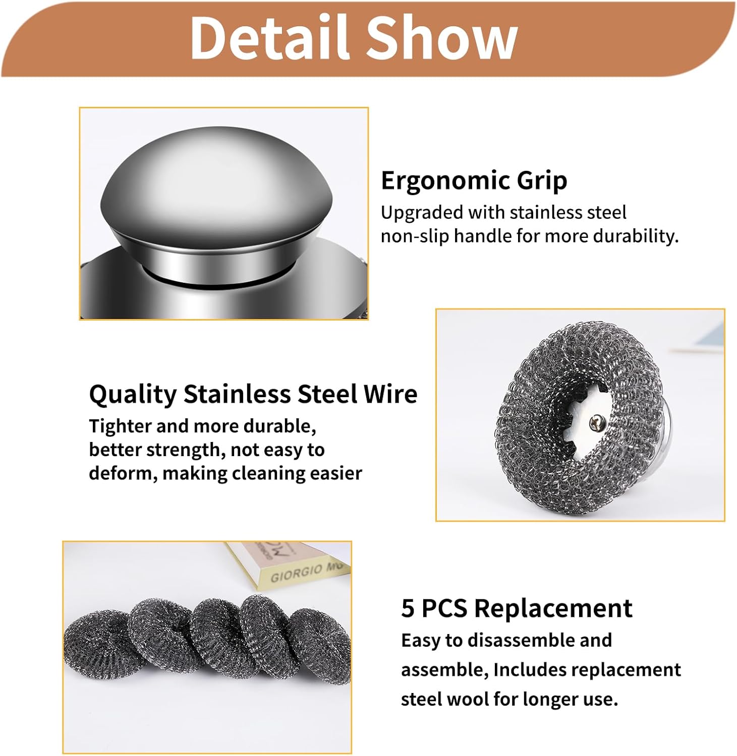 - [ You Will Receied ] 1pcs steel wool scrubber and 5pcs steel cleaning pads for replacement, which are easy to scrubbing stains and grease on kitchen appliances, as well as rust on various pot bottoms, making them shiny like new. In addition, you can use it combination with stainless steel cleaner to achieve better cleaning and improve cleaning efficiency