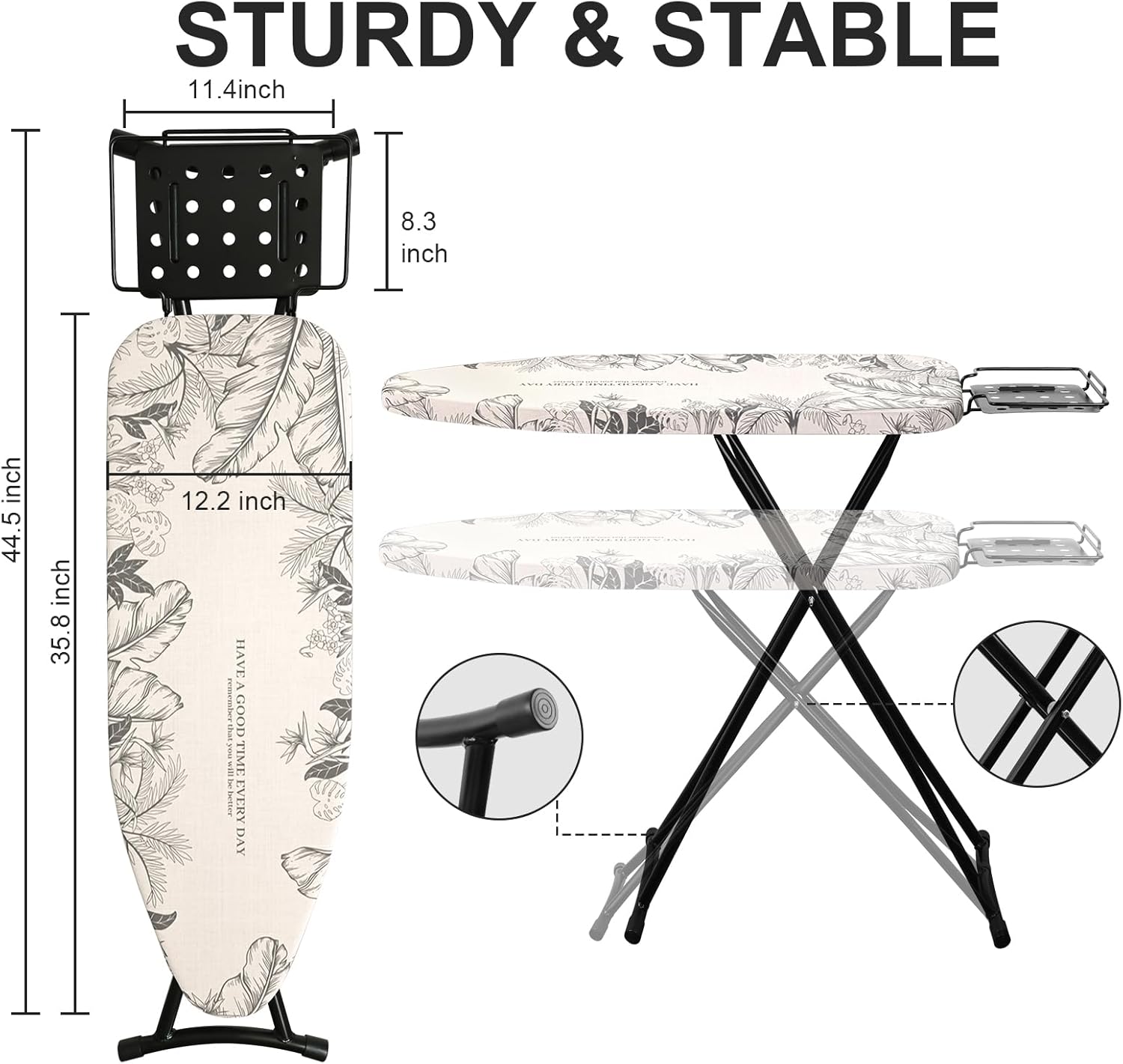 - Portable Iron Stand: Our iron board not only has a wide ironing surface of 39.4x13.4 inches, but also provides ample space for ironing various clothes. And it is also equipped with an iron stand, which can place the iron to better maintain good heat dissipation and help eliminate wrist fatigue during overuse.