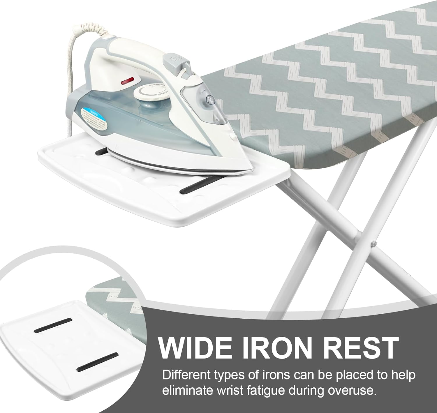 - Portable Iron Stand: Our iron board not only has a wide ironing surface of 39.4x13.4 inches, but also provides ample space for ironing various clothes. And it is also equipped with an iron stand, which can place the iron to better maintain good heat dissipation and help eliminate wrist fatigue during overuse.