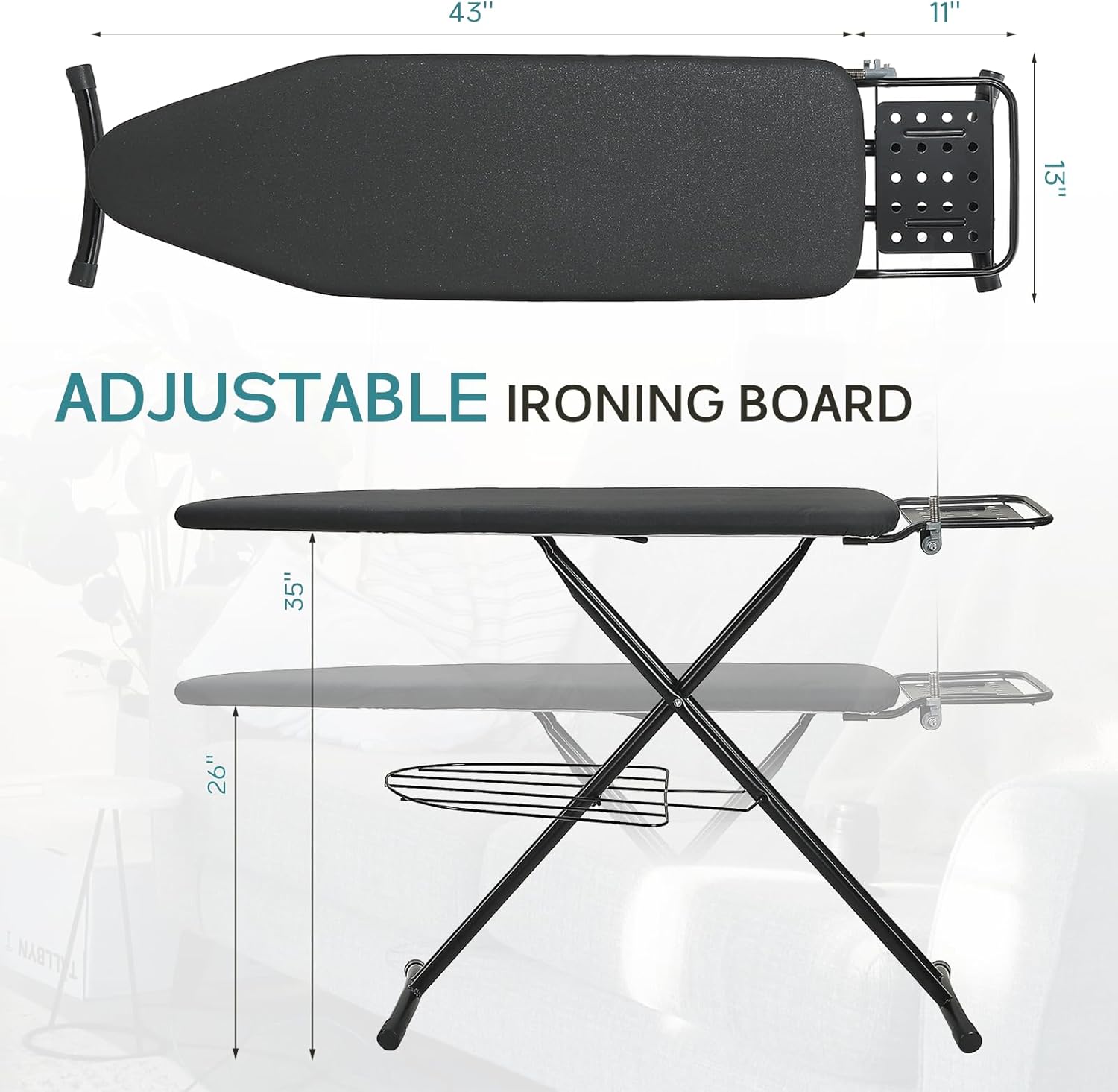 - Ironing Board Full Size: Our 43"x13" standard size ironing board is perfect for home use, with multiple height settings, it easily accommodates users of different heights. Stable and long-lasting construction to make your ironing experience more comfortable