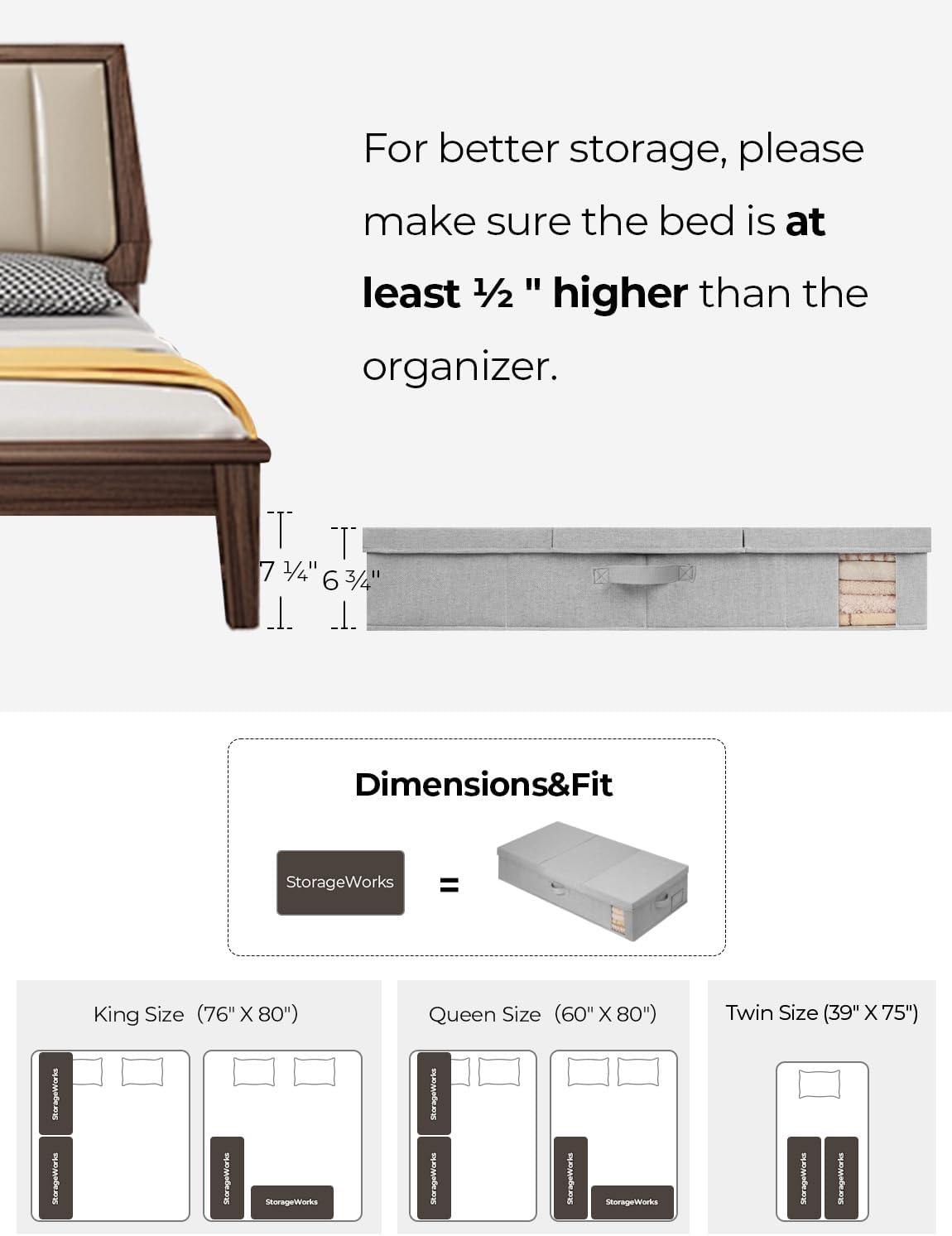 - Large Capacity: With dimensions of 39 ¼"L×17"W×6 ¾"H inches, the under bed storage containers offer ample space for storing a range of items, including clothes, blankets, bedding and shoes, maximizing your underbed storage space and organizing your bedroom. Please make sure that your bed is at least 7 inches high for better use.
