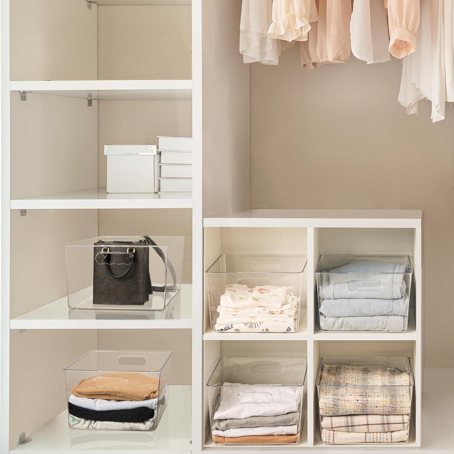 - Clear View Square Storage Bins---The plastic storage bins are clear,so you can see what you want without having to take the whole bin out of the cabinet. It will effectively to organize your books,crafts,toys on the cube shelf.Also, these bins can be prevent items from falling off shelves. Organzed stuffs with these containers to make your home neat.