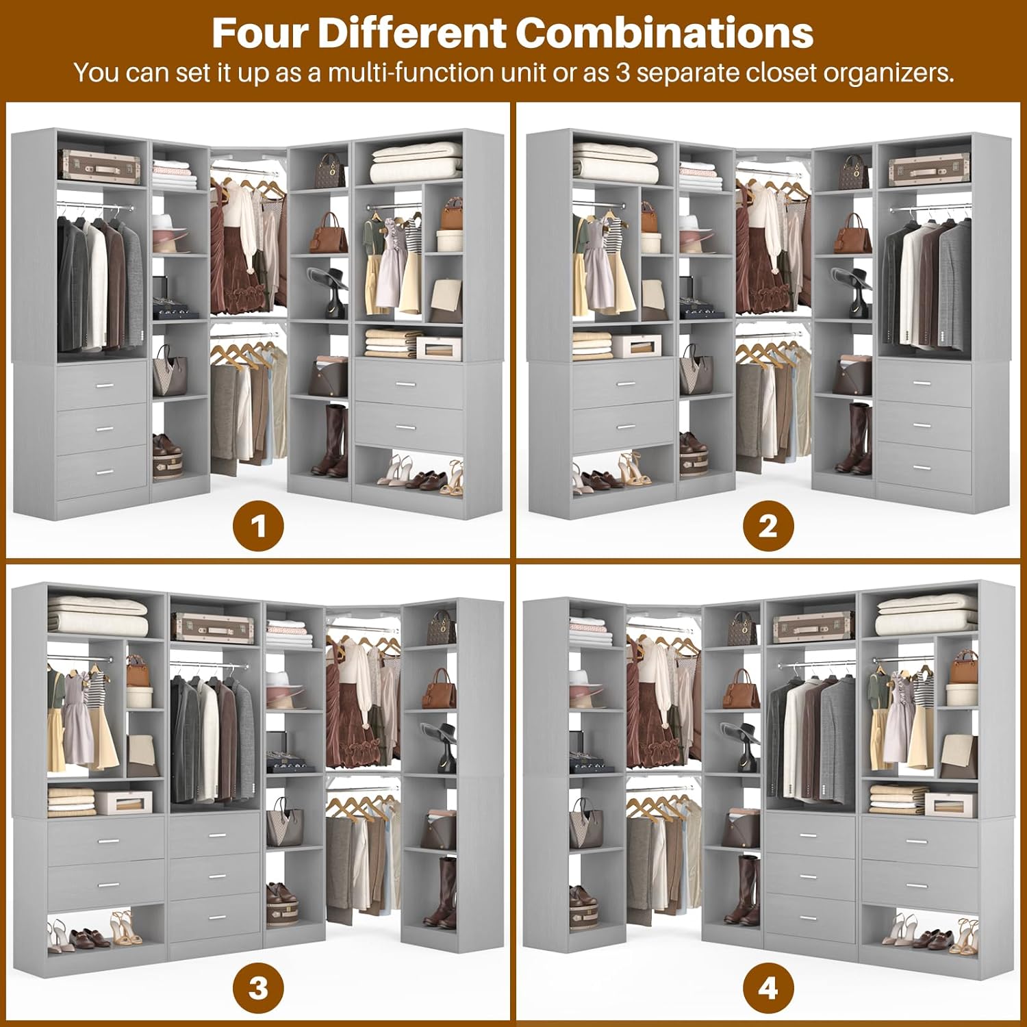 - DIY Customize Your Dream Walk-in Closet: Our closet systems put the design in your hands, allowing you to DIY to your liking. You have the flexibility to mix and match different modules based on room size, personal style and storage requirements to create an dreamful L- or U-shaped walk-in closet.