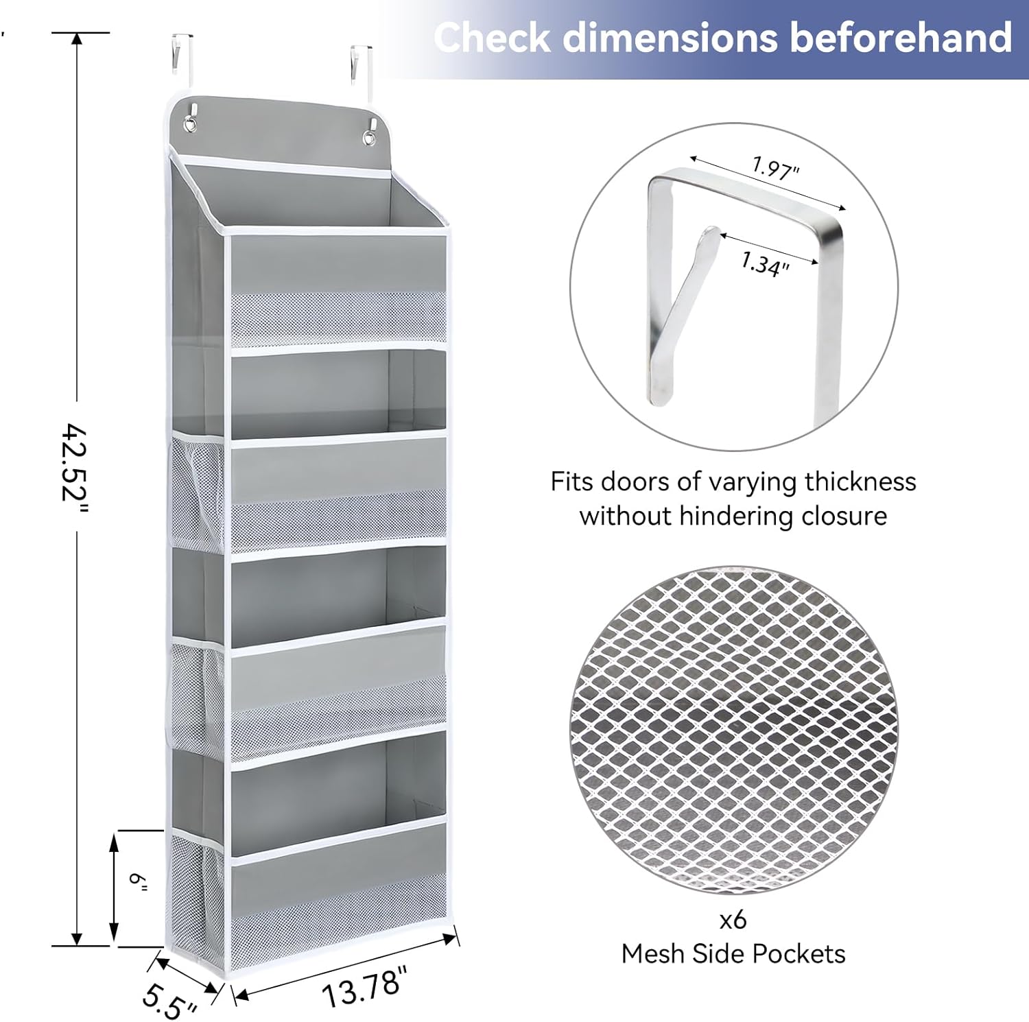 - TOP EASY INSTALLATION: Our Over Door Organizer can be effortlessly installed without any tools. With three width adjustable metal hooks, making this over the door storage organizer universally fits for most of the doors less than 1.98" thick. What you need to do , is just put the hooks onto the door without making holes on the door
