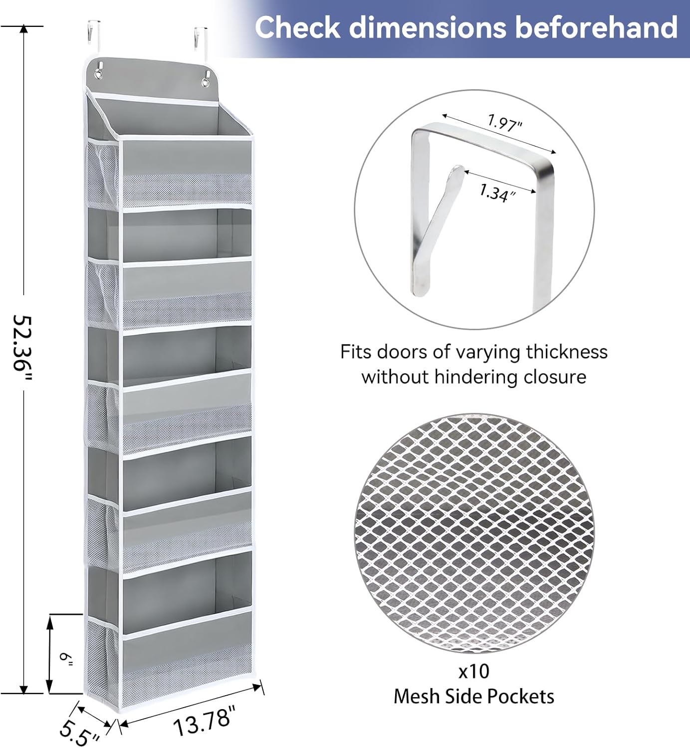 - 44 LBS LARGE LOAD CAPACITY & SPACE SAVING: Making of non-woven fabric and featuring with 4 roomy pockets (up to 14.17" /36 cm long) and 6 additional mesh side pockets, this Over the Door Organizer Storage thoughtfully expands storage space, making it an ideal space maximizer for any room