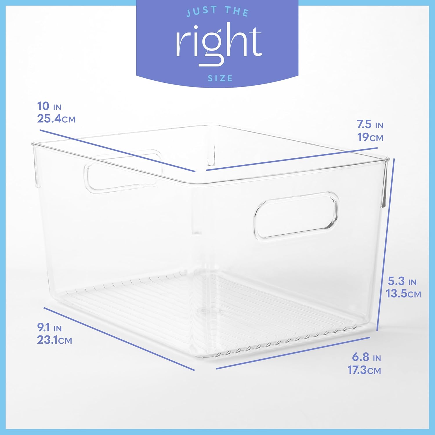 Plastic Food Storage 4 Pack Clear Container Bin with Handles for Organizing Kitchen, Pantry, Refrigerator, Freezer, Pantry, Cabinet, Closet, Bathroom. 10”x7.5”x5.3”