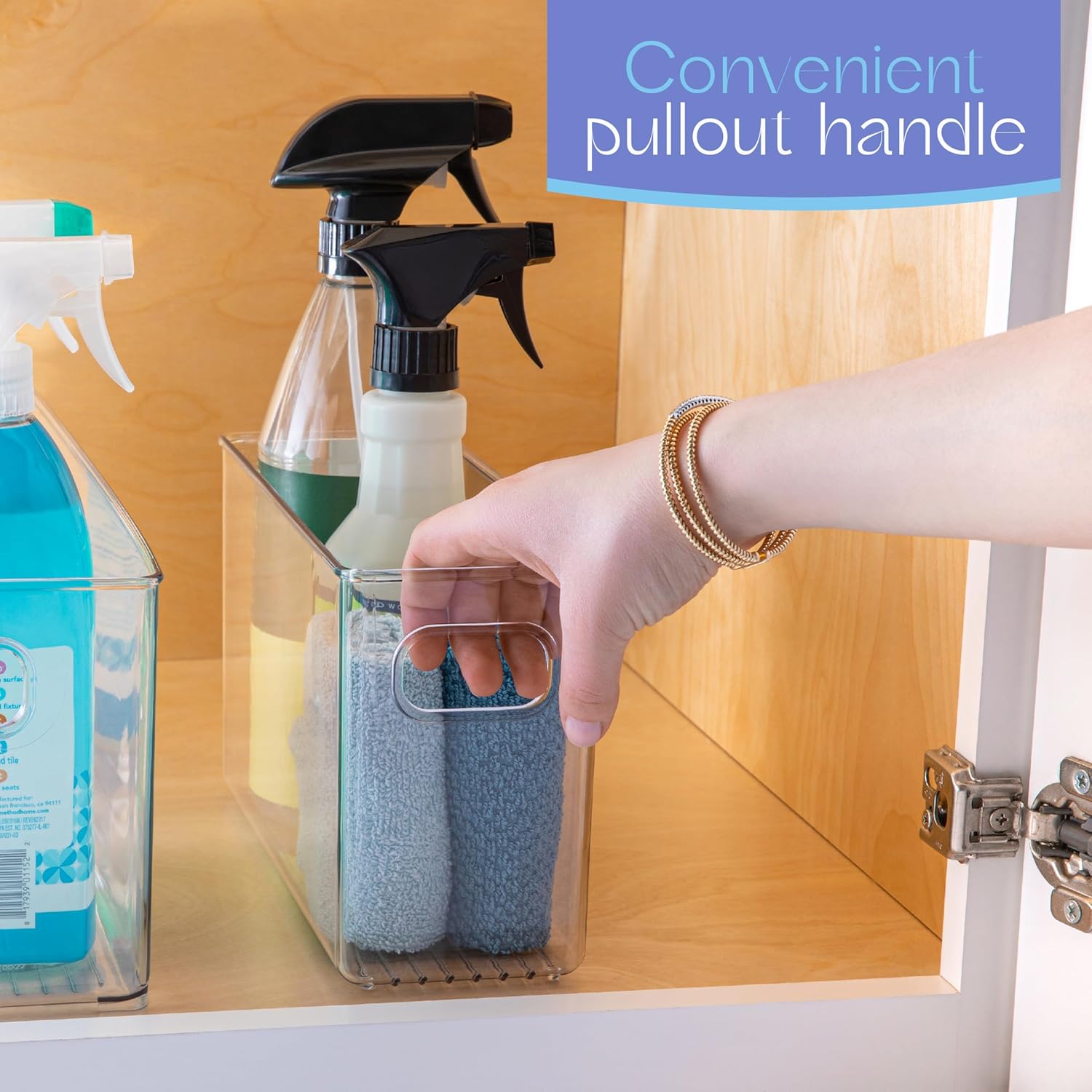 Plastic Food Storage 6 Pack Clear Container Bin with Handles for Organizing Kitchen, Pantry, Refrigerator, Freezer, Pantry, Cabinet, Closet, Bathroom. 10”x4”x6”