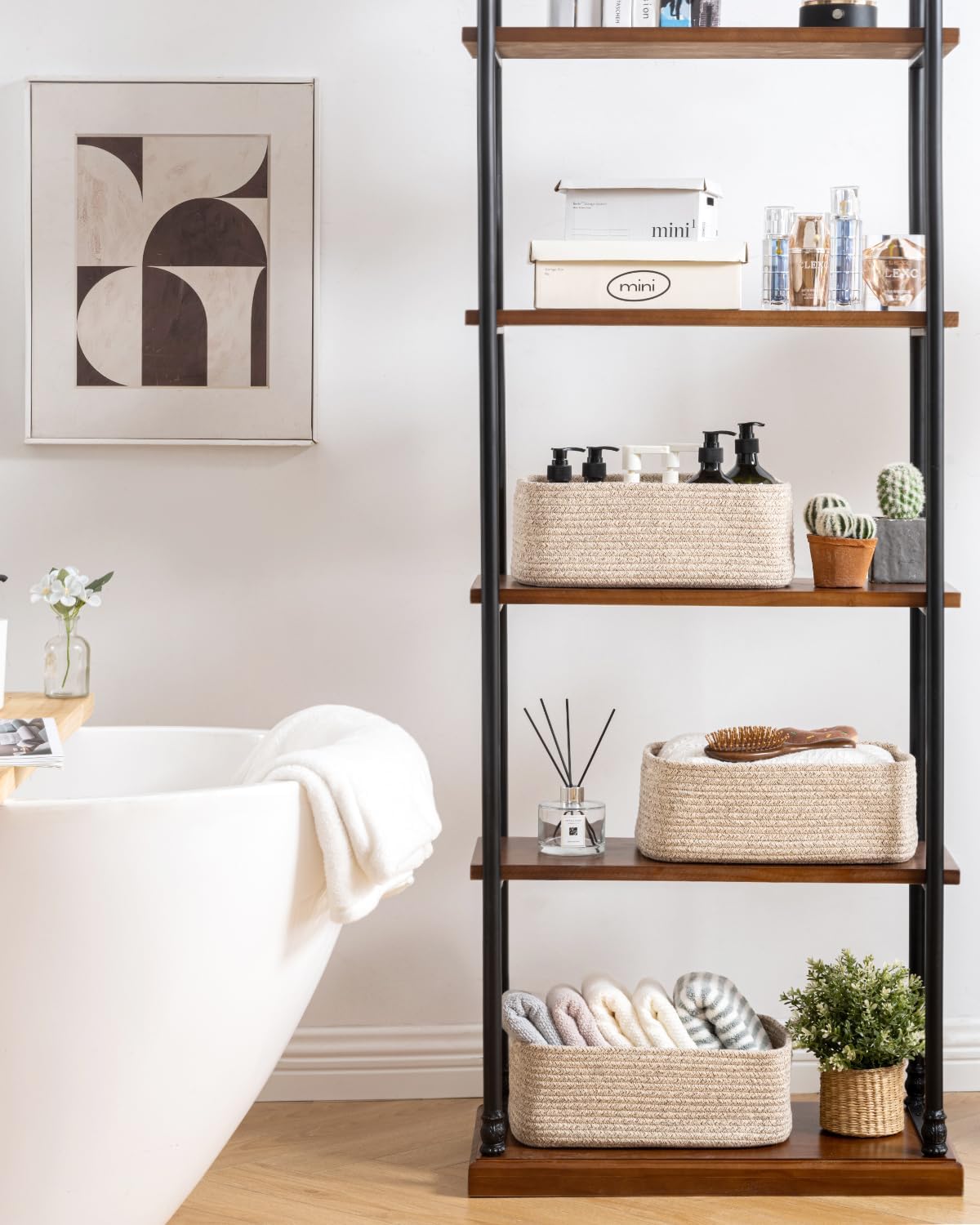- [ Elegantly Designed to Match Any Décor ] Our small rope basket creates a minimalist appearance, and it adds a touch of warmth and texture to any room. The classic solid color design ensures seamless integration with your existing aesthetics, complementing any decoration. Perfect as decorative storage baskets for shelves, cabinets, and any open display space, making them a stylish and practical addition to any decor, enhancing the overall aesthetics of your room