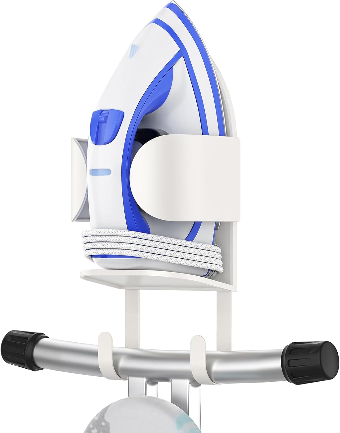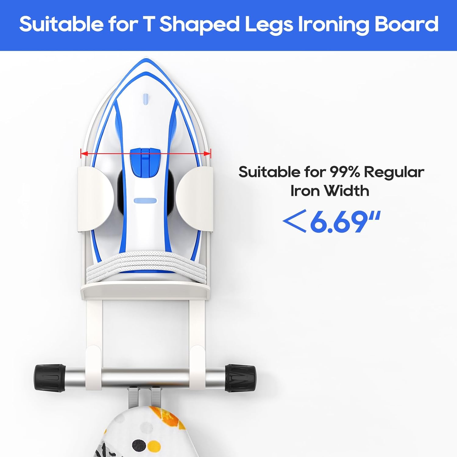 - LAUNDRY ROOM SPACE-SAVER: Store your iron and ironing board in one spot; Metal basket holds your iron. 2 long metal hooks can hang your ironing board: suitable for T-shaped ironing board legs. The hooks and basket are detachable so you can install in the location that is convenient for you.