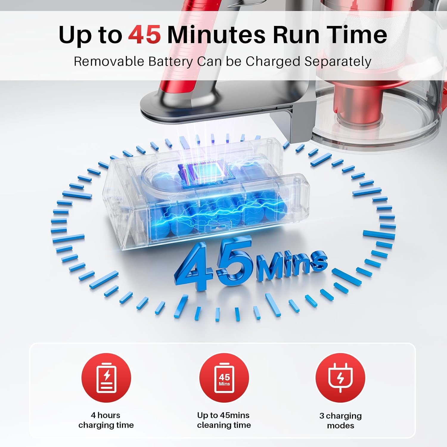 - 🌲【Extended Runtime】The cordless vacuum cleaner is equipped with a 2200mAhbattery that ensures a thorough cleaning of an entire 200㎡ house. vacuum cleaners for home can run for 20 minutes at max suction and 40 minutes at min suction. BSNAW rechargeable vacuum cleaner only takes 4 hours to fully charge. You can purchase extra batteries in the store for a longer run time.