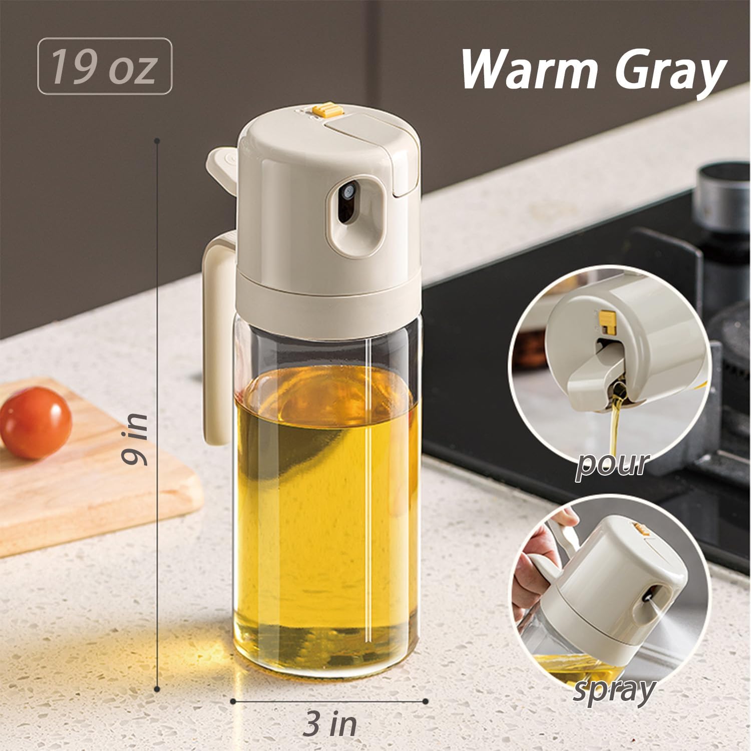 - 550ML LARGE CAPACITY AND LEAK-PROOF DESIGN: 19oz oil sprayer for cooking, holds more oil than standard sprayers (no need to refill daily!). Seal with leak-proof silicone gasket and ergonomic handle for clean use in the kitchen or outdoor grilling.