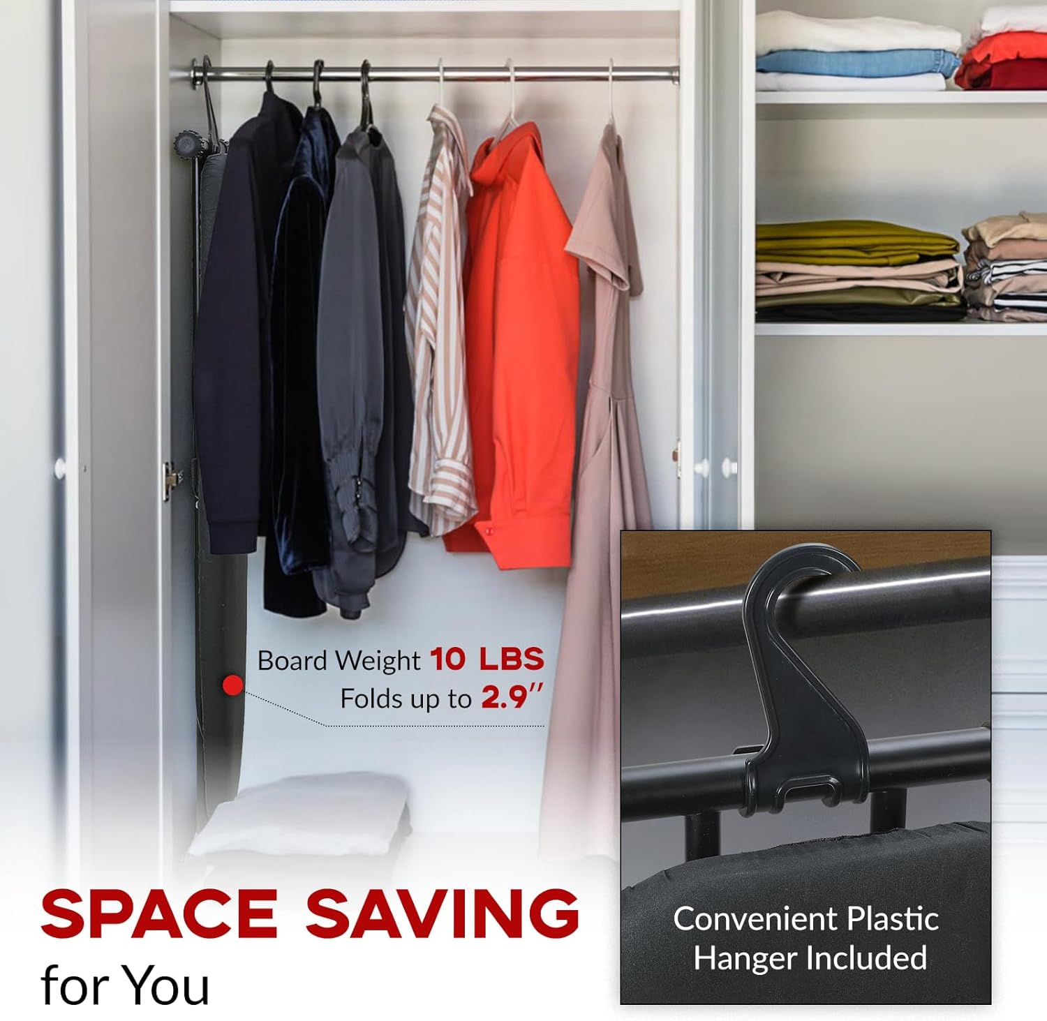 - Compact Iron Board: The ironing board is lightweight (9.7lb), measures 58.2x13.7x2.8 in when folded, and comes with hooks that make it easy to hang in a closet, on a wall, behind a door, or in other tight spaces