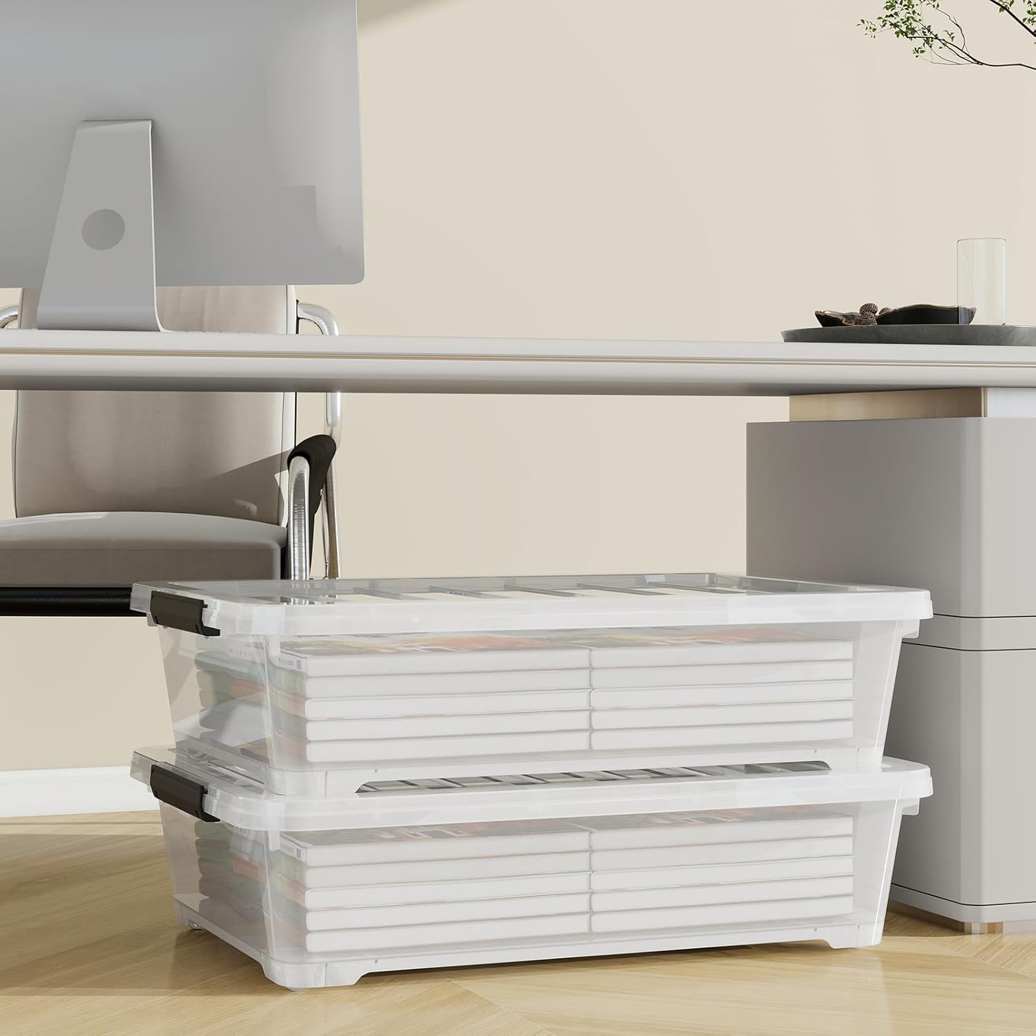 4Pack 40 Qt Plastic Under Bed Storage Organizer Bin Container with Secure Lids and Durable Wheels, Clear