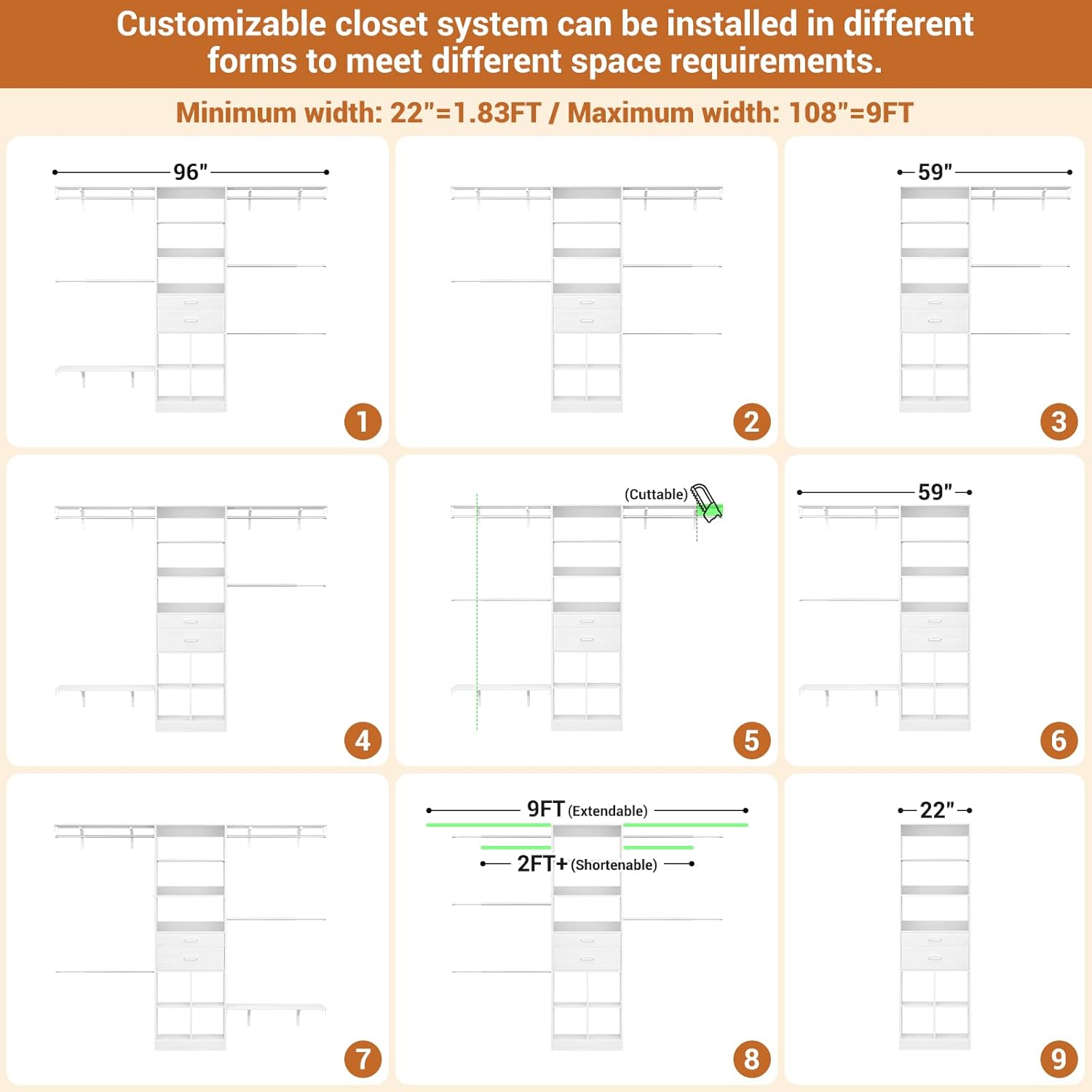 - Customizable Closet System - Besiost closet system with drawers is a valuable addition to your nursery organization and walk-in closets. The small modern closet comes with additional cuttable shelves and adjustable hanging rods, designed to fit well in nurseries of varying sizes. Width: 59"–96", Height: 80"