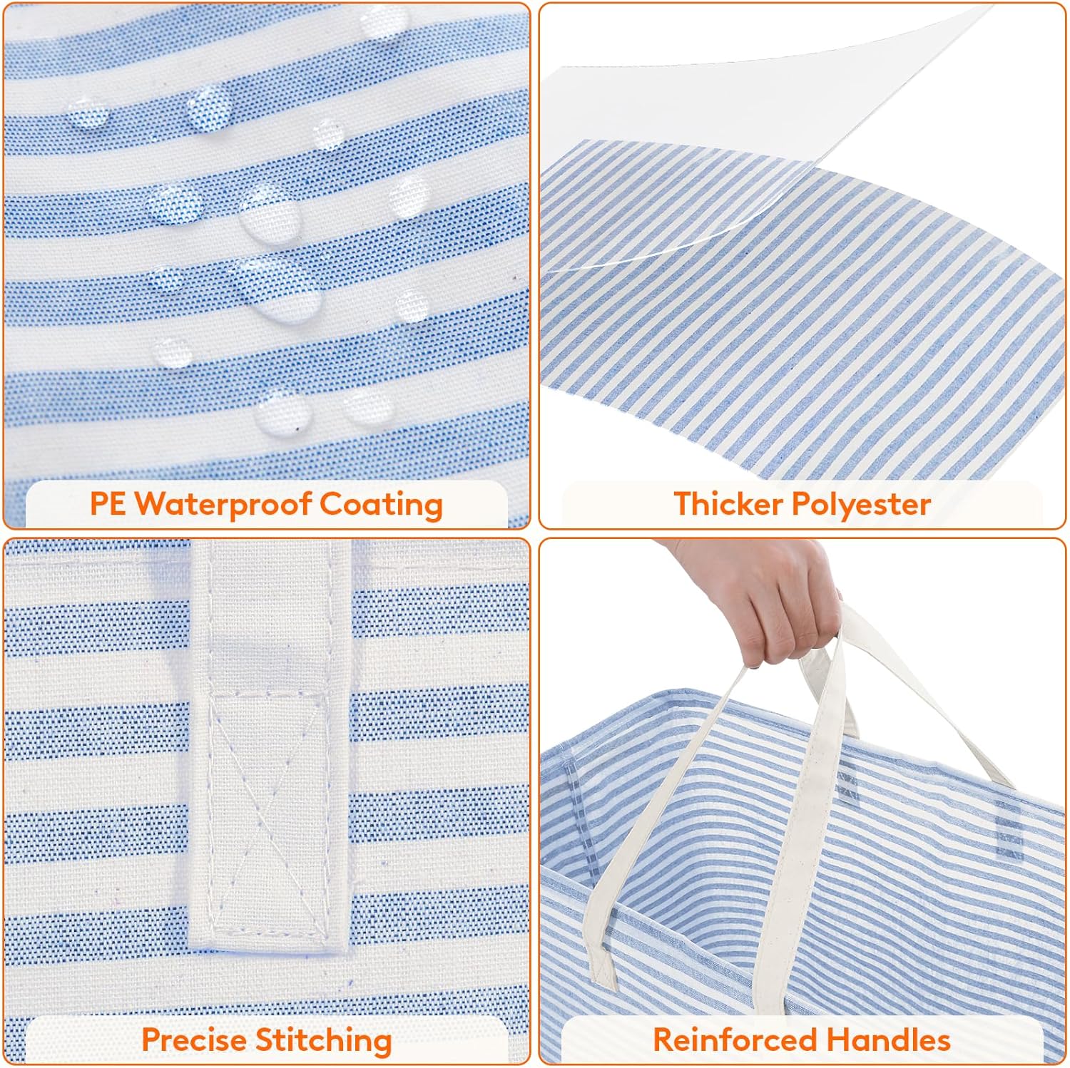 - Premium Material: The foldable clothes basket is made from thick polyester and primuin cotton. The interior features PE waterproof coating can keep stored items dry. Simply use a wet cloth to wipe off the dirt. Do not clean it in washing machine and dryer, as doing so may damage the leakproof PE coating.