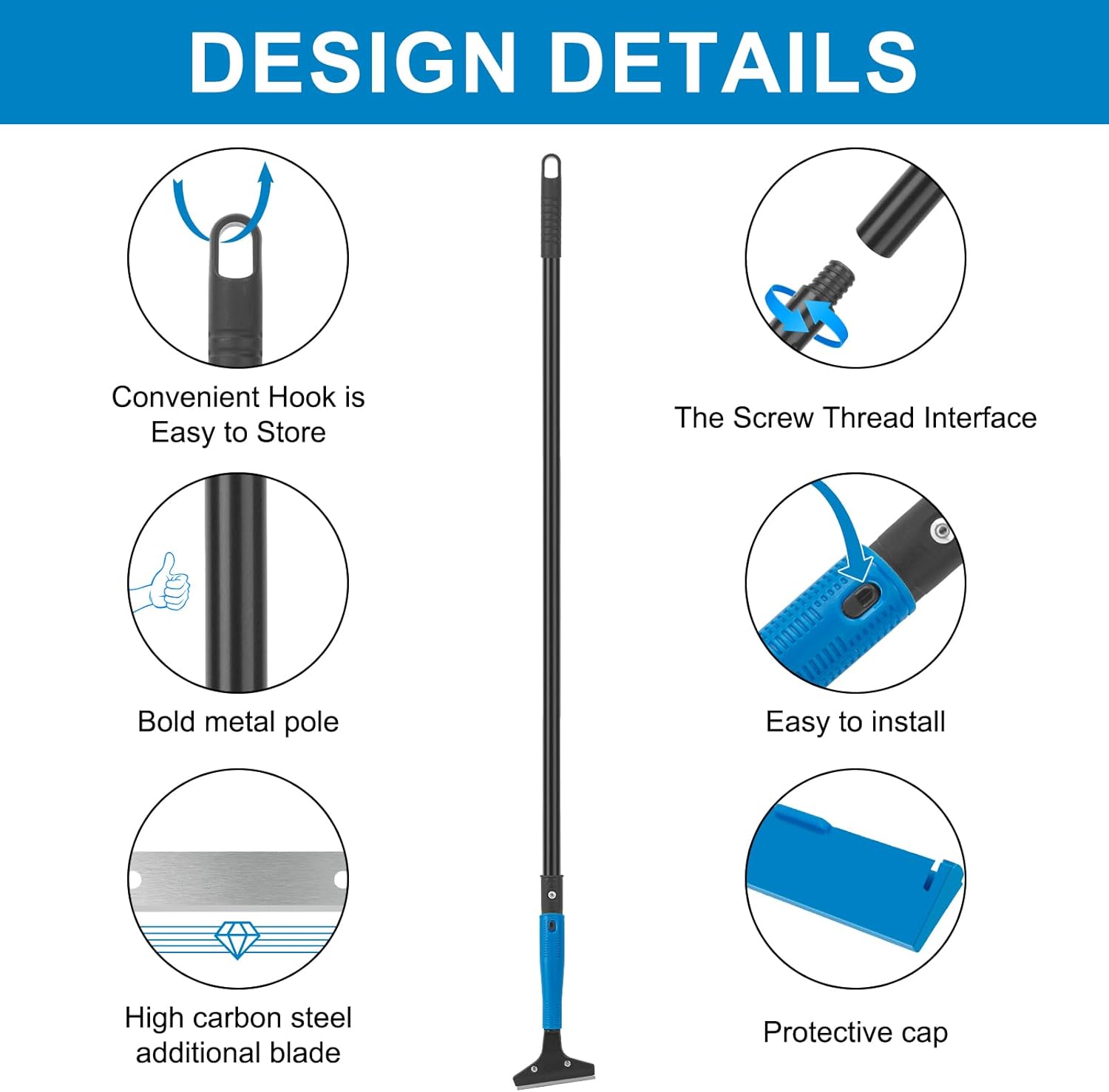 - 🌟The 4" wide blade cleans a larger area than other mini scrapers, 45.7" long handle saving effort and improving cleaning efficiency,10 replacement blades, safety cap, and screwdriver are also provided.