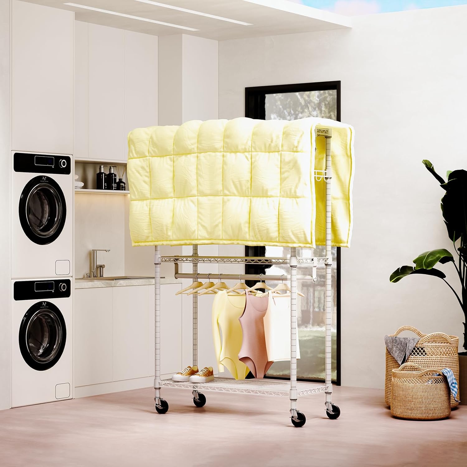 - Lockable 360° Wheels And Multifunctional: This rolling clothes rack has 4 heavy-duty rolling wheels, and thus you can easily move anywhere you need, such as the entry closet, laundry room, hallway, balcony, bedroom, cloakroom, bathroom, garage, and more. And 2 of them are lockable, which ensures more safety.