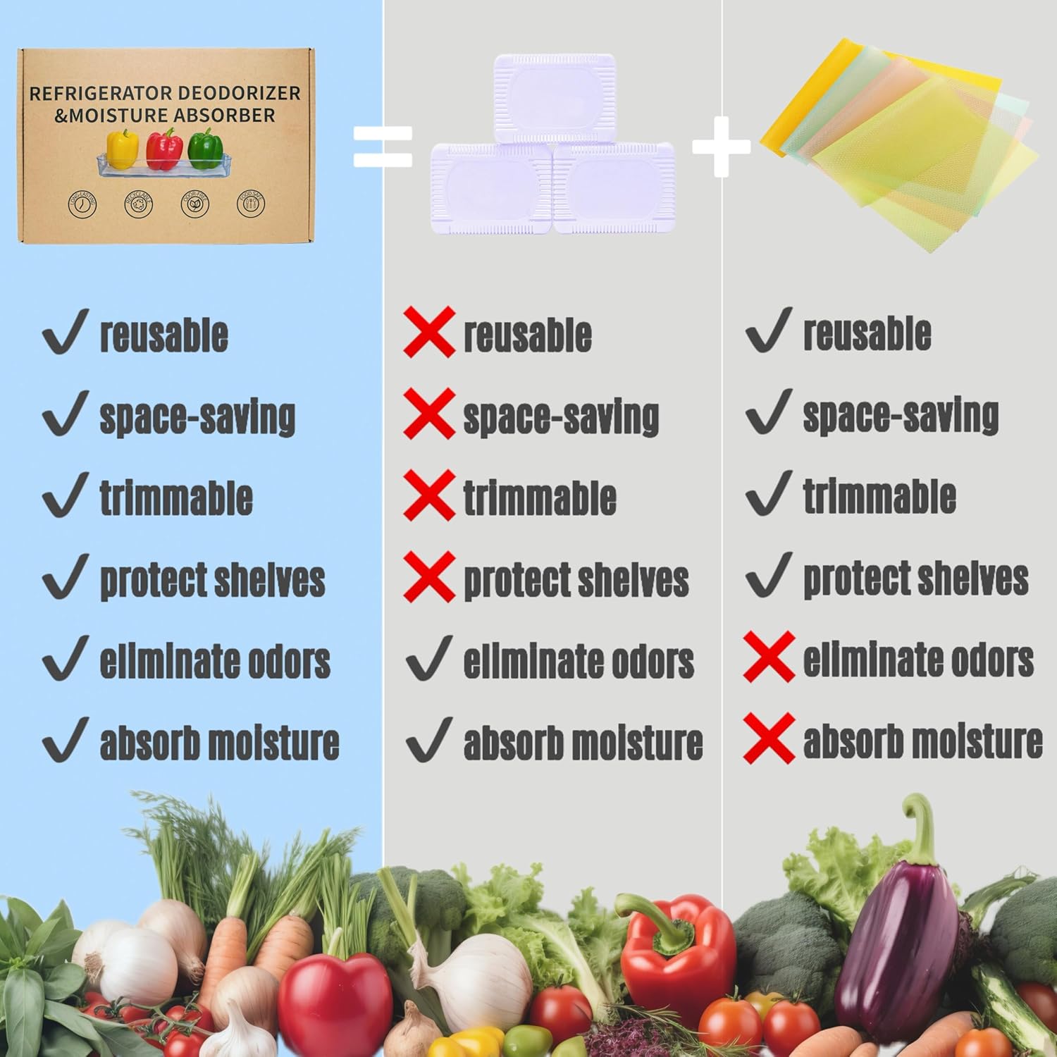 - Most Effective Odor Elimination Technology: Precision-engineered compartmentalized squares ("deodorizing chambers") densely packed with activated charcoal particles and super-absorbent silica gel – targets odors at molecular level while balancing fridge humidity to 40-60% ideal range.