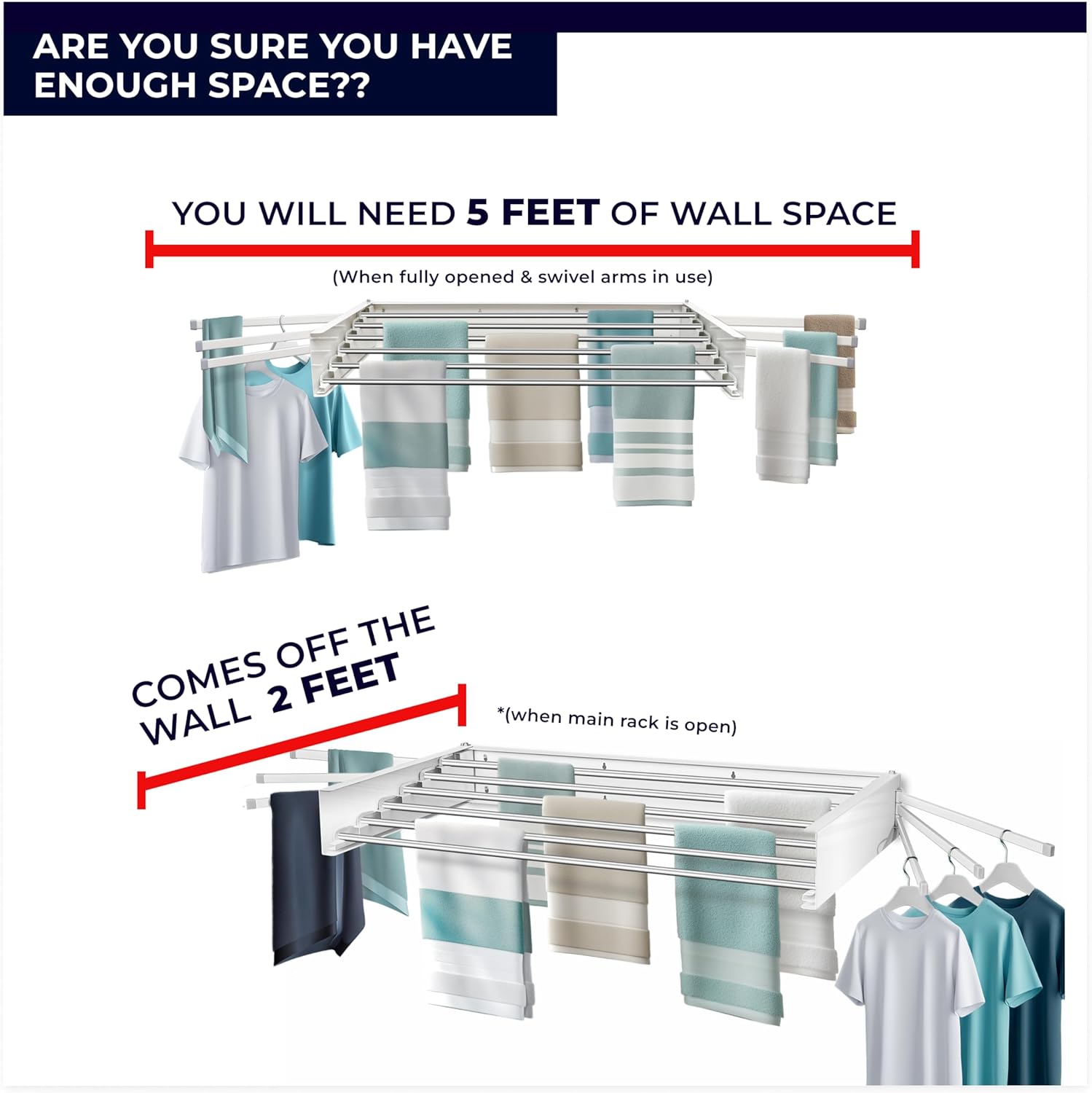 - 𝗨𝗻𝗺𝗮𝘁𝗰𝗵𝗲𝗱 𝗦𝗽𝗮𝗰𝗲 𝗦𝗮𝘃𝗶𝗻𝗴: Opens out or closes shut in seconds for a clutter-free solution that’s ready when you need it and discreet when you don’t. The adjustable towel racks can be used without having to open the full rack - so you only use the space you need.