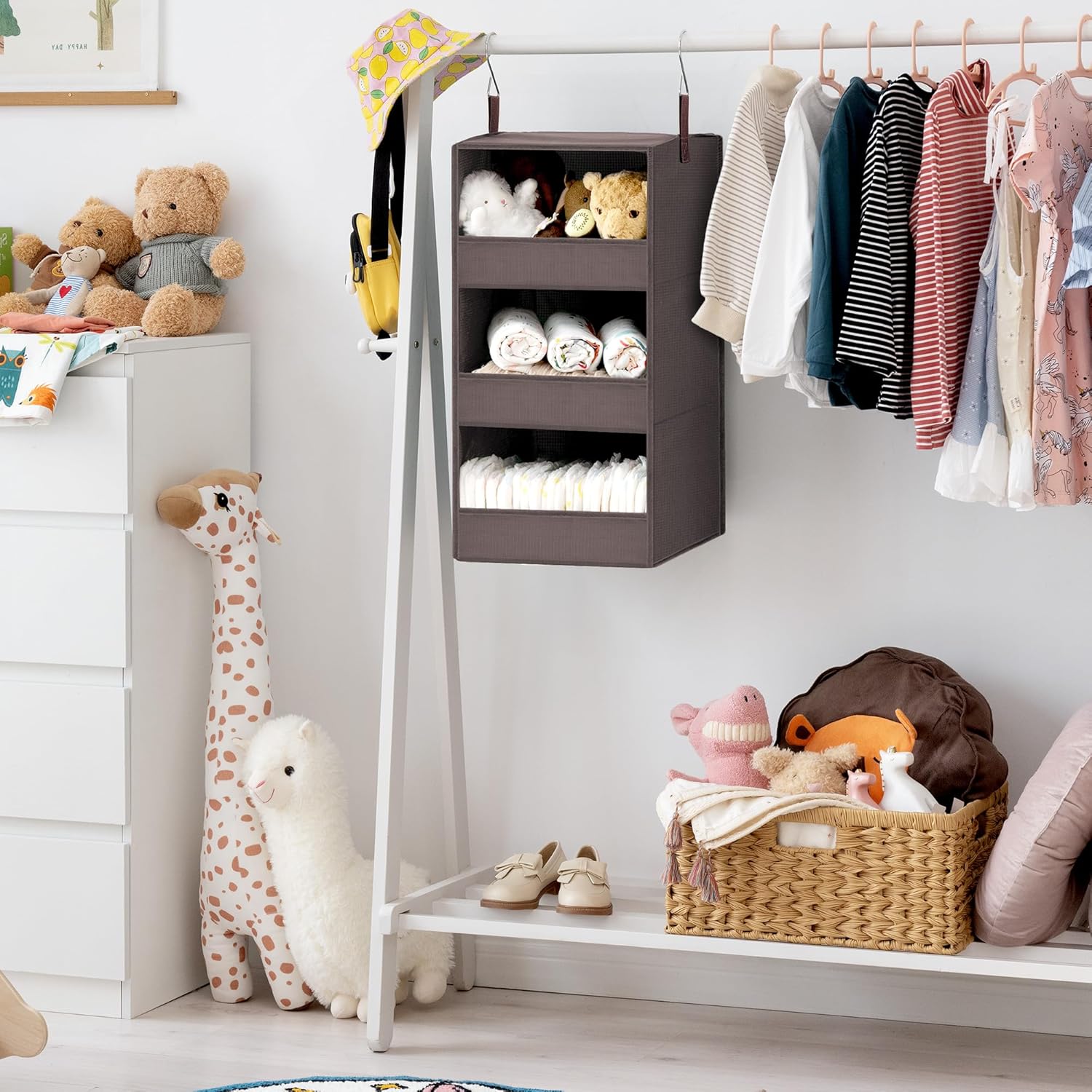 - Leak-Proof Design: Unlike traditional open hangers, our hanging shelf features a unique leak-proof design. Each shelf has a front strip that prevents items from falling off, ideal for storing baby clothes, sweaters, towels, purses, shoes, and other accessories.