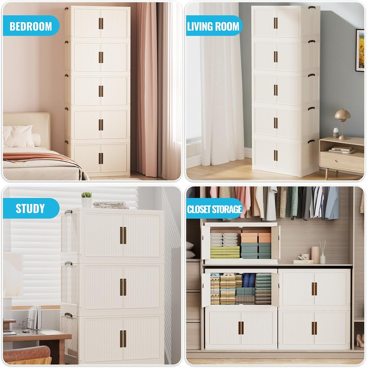 - EASY TO MOVE: Equipped with four universal wheels, these stackable storage bins can be easily moved from room to room, enhancing their applicability in homes, kitchens, bedrooms bathrooms, closets, bathrooms, offices and more.
