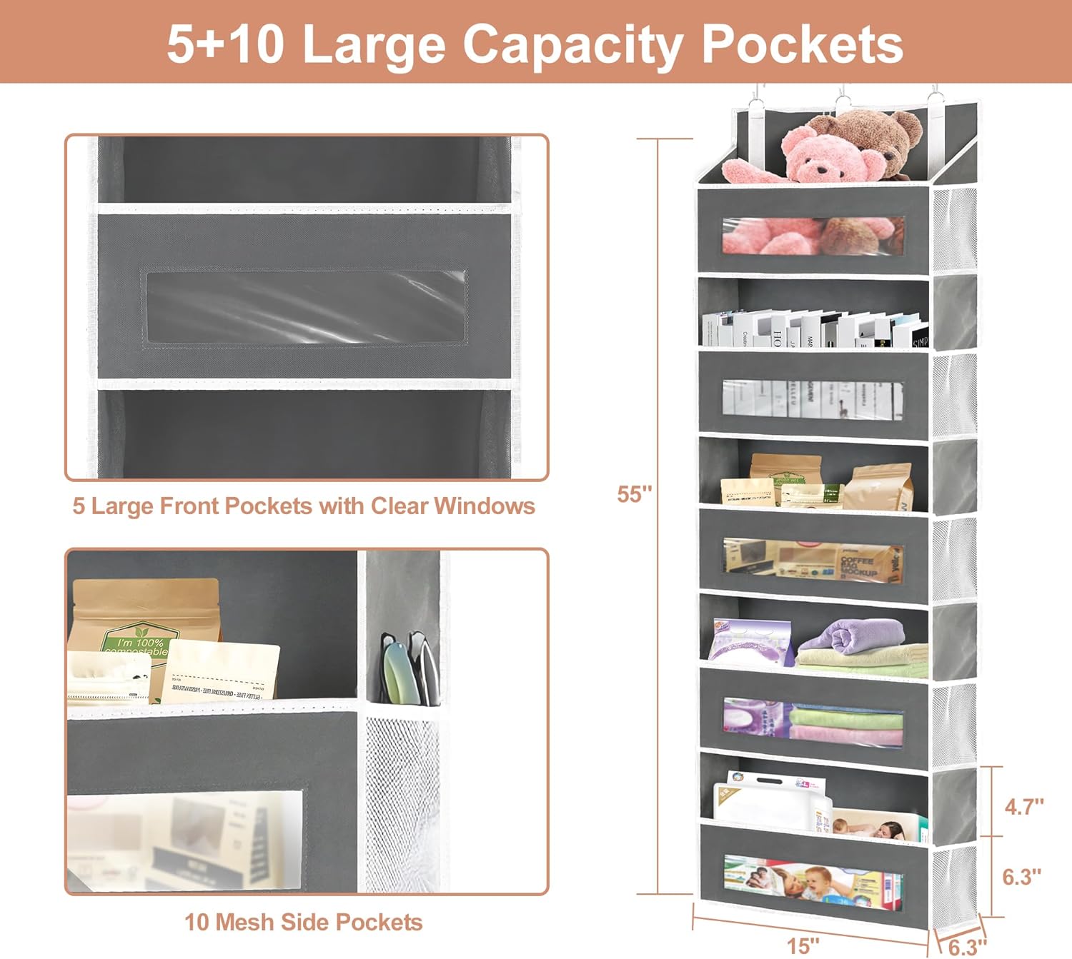 - 5+10 Ample Storage Space: The room organizer features spacious 5-tier pockets (15" x 11" x 6.3") and 10 side mesh pockets, providing plenty of space for organization and storage. It is an ideal choice to keep your home neat and tidy
