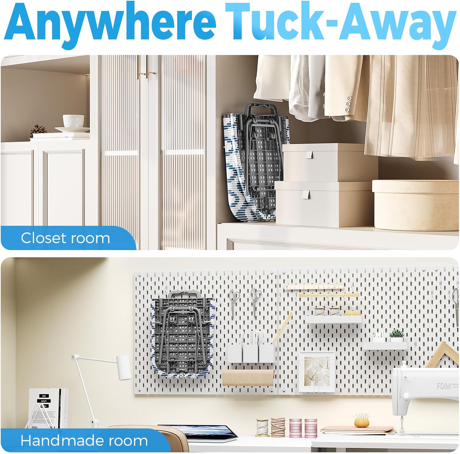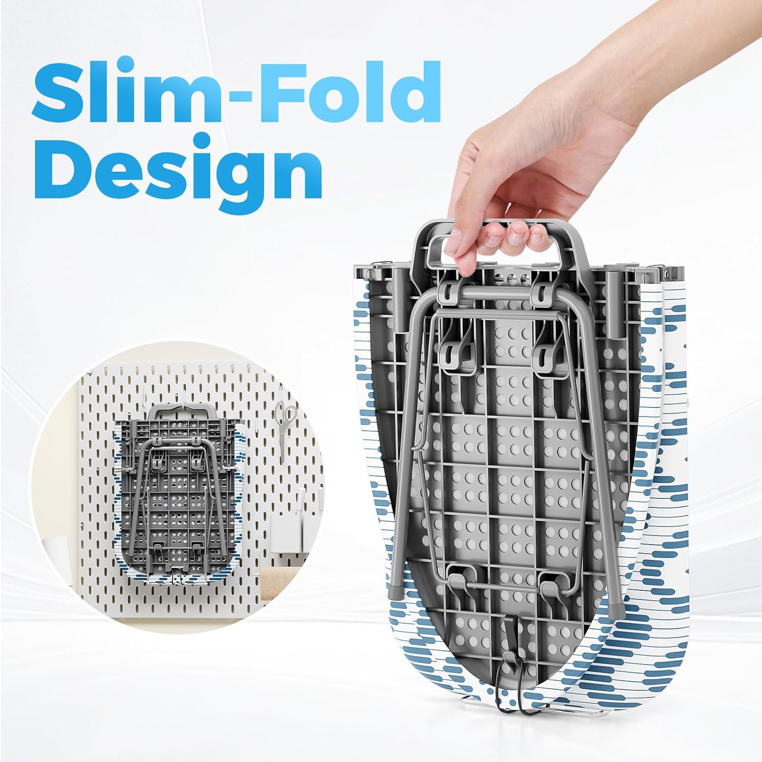 - Foldable and Space-Saving: KINGBOARD compact ironing board is specially designed to save space. After folding, it measures 12"x16.5" fits anywhere where space is limited. Its own hanging hook, easily hangs over any standard door, also can storage in a closet. Handle design is easy to carry wherever you needed