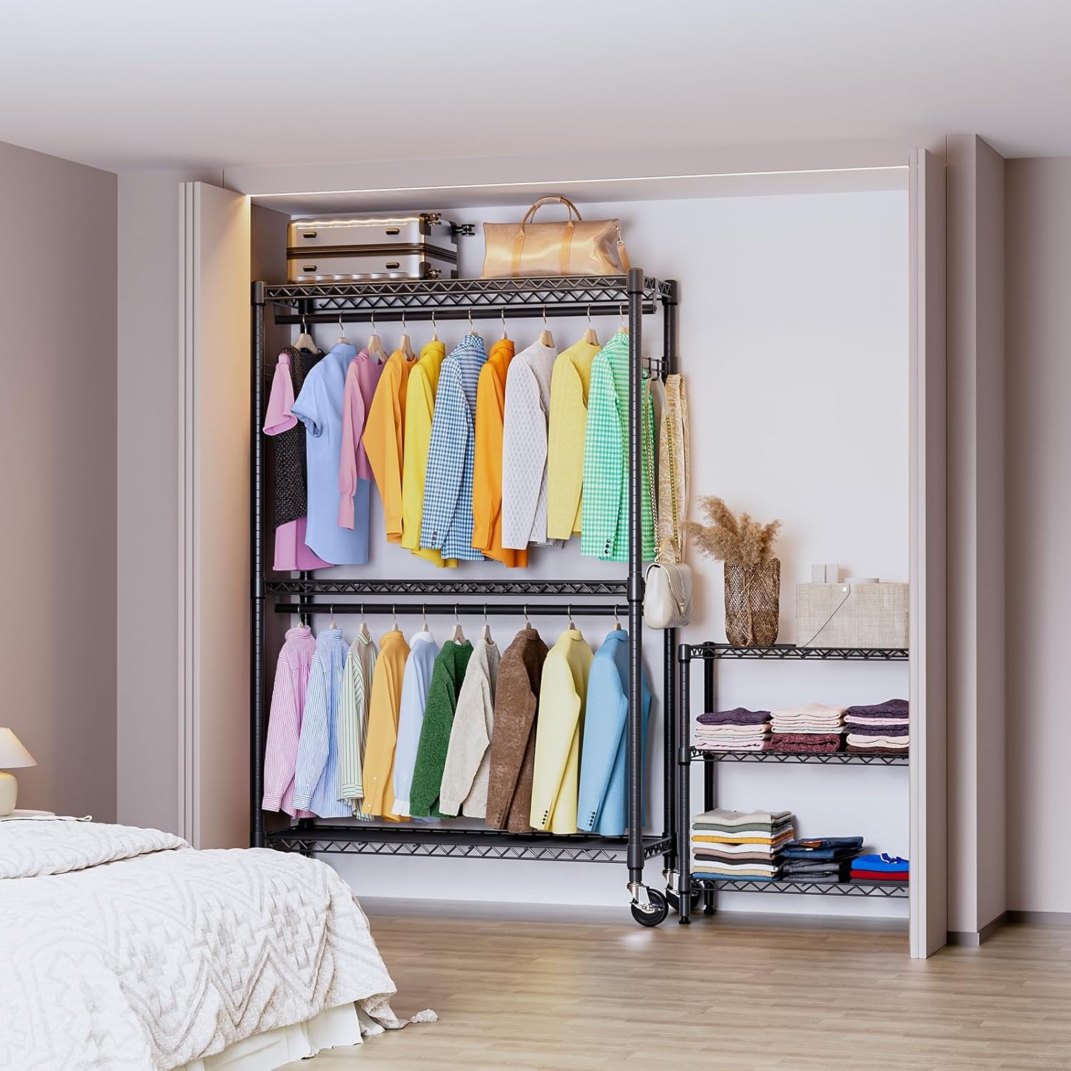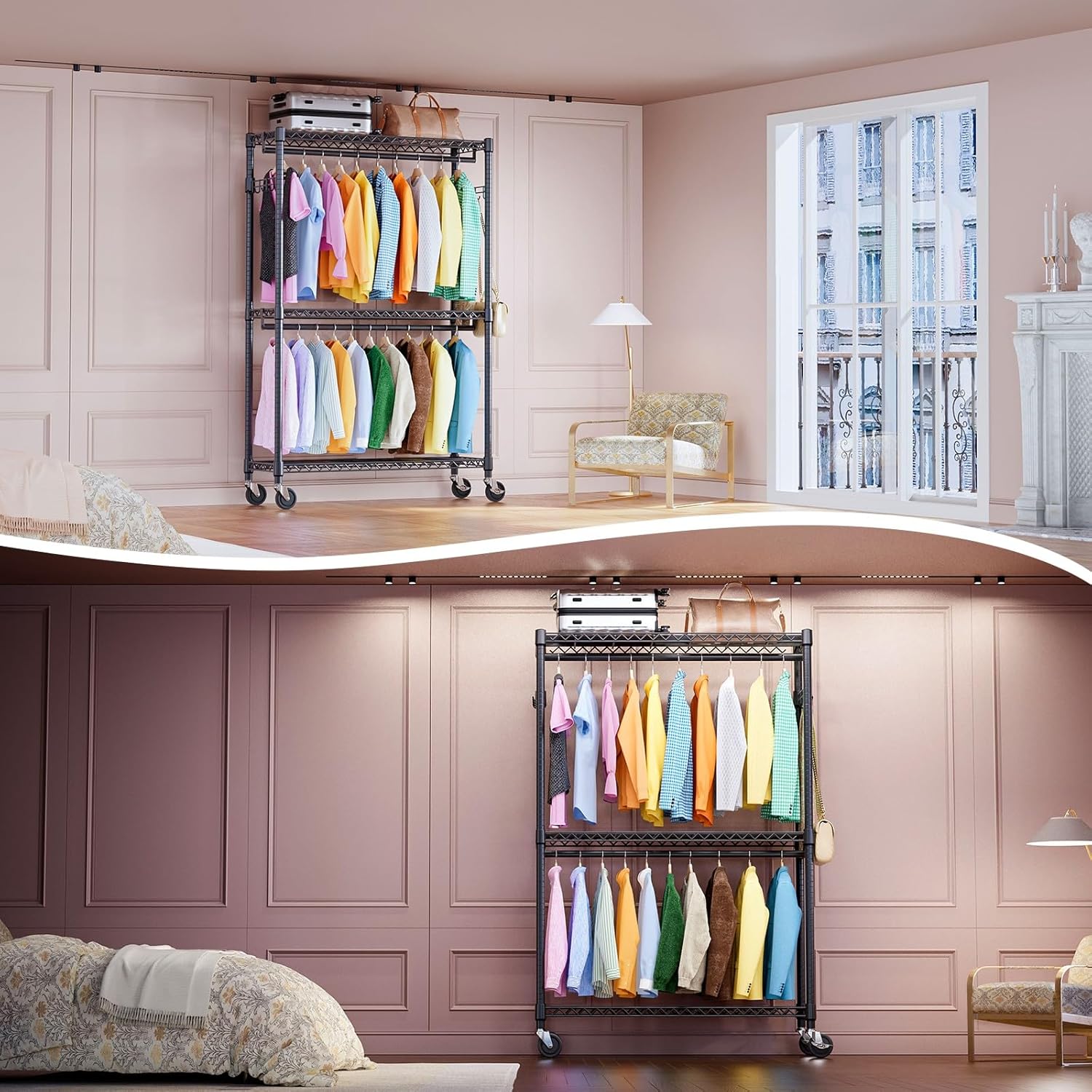 - Rotatable 360° Wheels And Versatile: This rolling clothes rack has 4 heavy-duty rolling wheels, and thus you can easily move anywhere you need, such as the showroom entry closet, bathroom, garage, laundry room, hallway, balcony, bedroom, cloakroom, and more. And 2 of them are lockable, which ensures more security