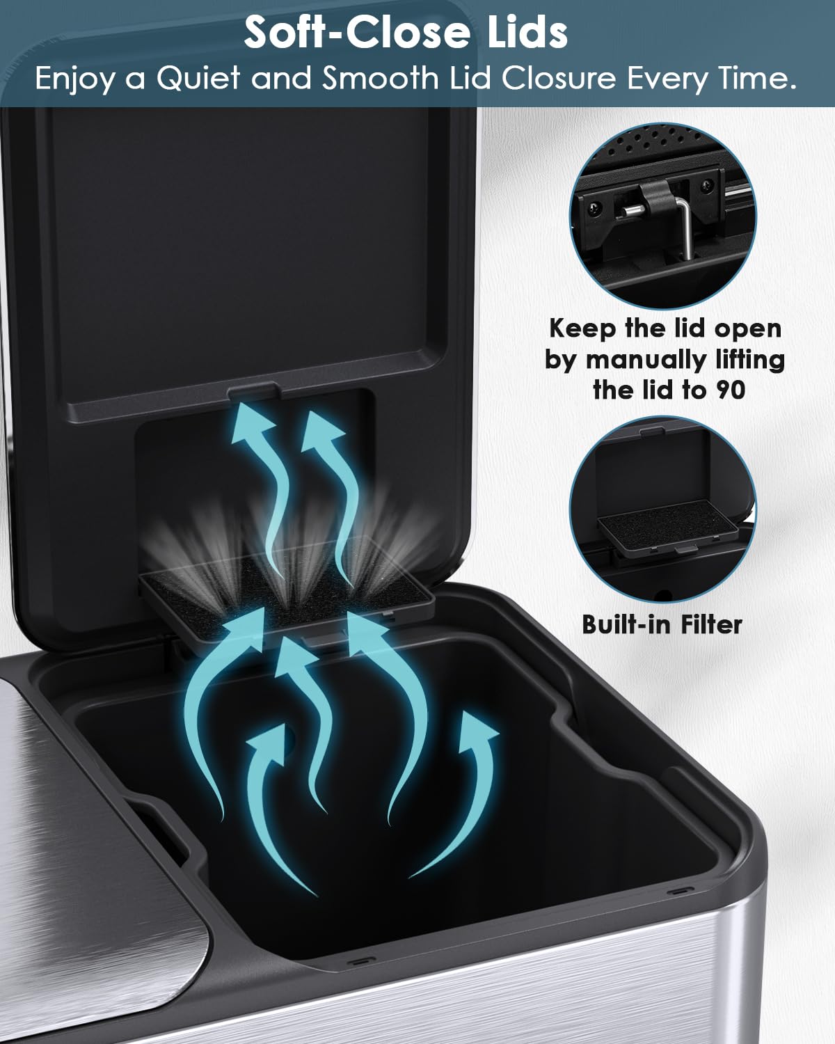 - Built-in Box for Odor Control: Dual trash combo is perfect for the kitchen. Both lids are equipped with built-in box for storaging cleaning material for helping to improve the air quality around the trash can. Enjoy a clean and pleasant environment.
