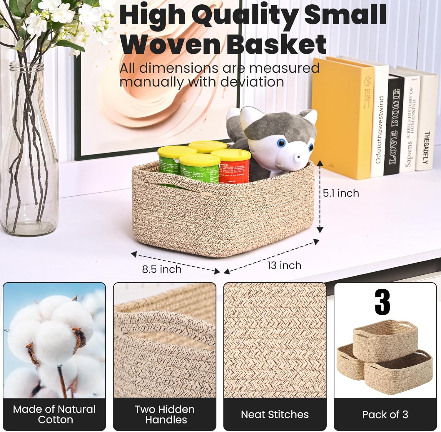 Small Baskets for Organizing, Woven Storage Baskets for Shelves, Small Rope Basket for Storage, Decorative Little Baskets for Gifts Empty, 13"×8.5"×5.1" (3 Packs) Brown
