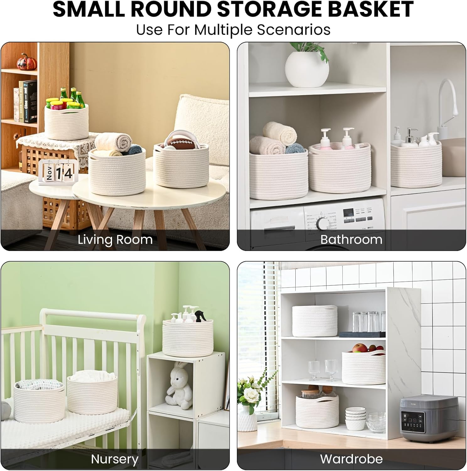 - Compact Size: These off white, round small storage bins are ideal for organizing and storing your essentials. Its compact size of 9.7×9.7×7 inches makes it a versatile organizing basket for any space. Perfect for organizing small items on your desktop, in closets, or drawers.They can add a touch of warmth and texture to any living room, bedroom, sofa, nursery, shelves, wardrobe or closet