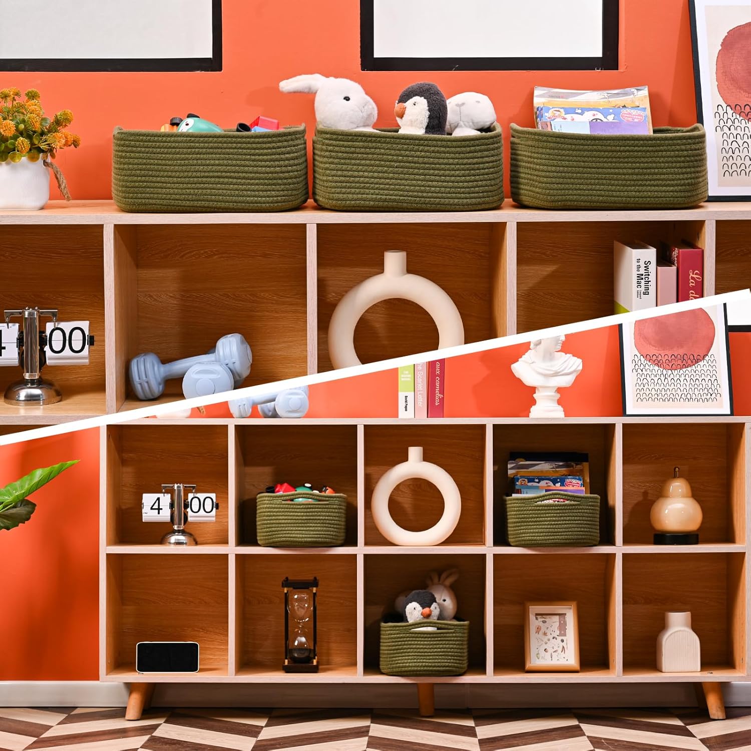 - Compact Size: These green, rectangular small storage bins are ideal for organizing and storing your essentials. Its compact size of 13×8.5×5.1 inches makes it a versatile organizer basket for any space. Perfect for organizing small items on your desktop, in closets, or drawers.They can add a touch of warmth and texture to any living room, bedroom, sofa, shelves, wardrobe or closet