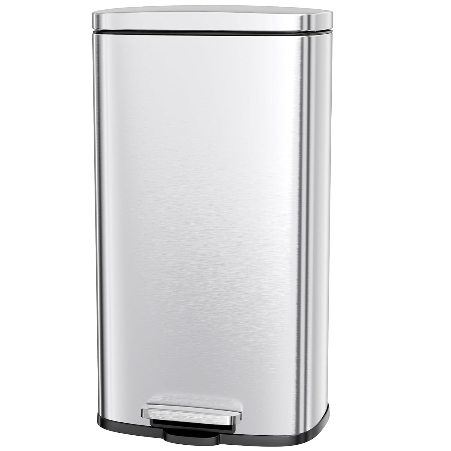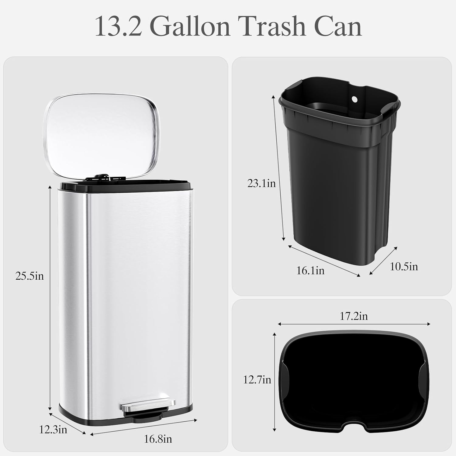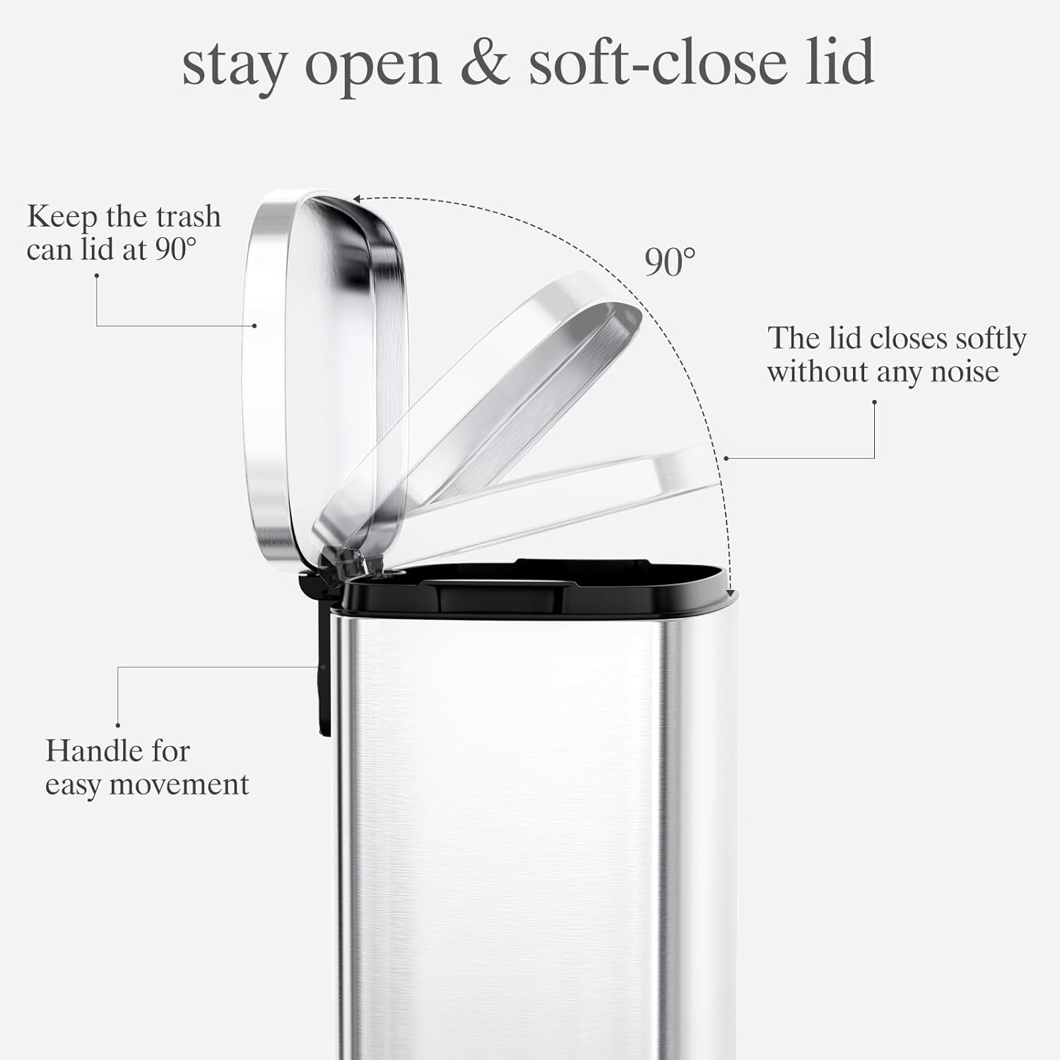 AthLike Trash Can, Stainless Steel Kitchen Garbage Can, Step Waste Bin with Hinged Lid and Removable Inner Bucket, Soft-Close, Dustbin for Bathroom Bedroom Living Room Home (Silver, 13.2 Gal)