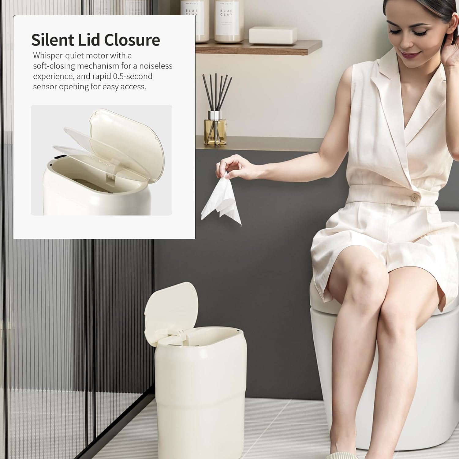 Slim Motion Sensor Trash Can for Bathroom, Automatic Compact Touchless Garbage Bin with Lid, 2.4 Gallon Small Electric Waste Basket for Narrow Apartment Dorm Office, Kitchen, Bedroom, Cream White