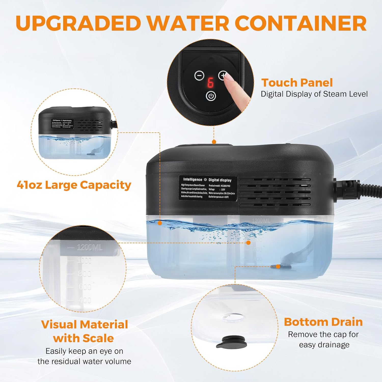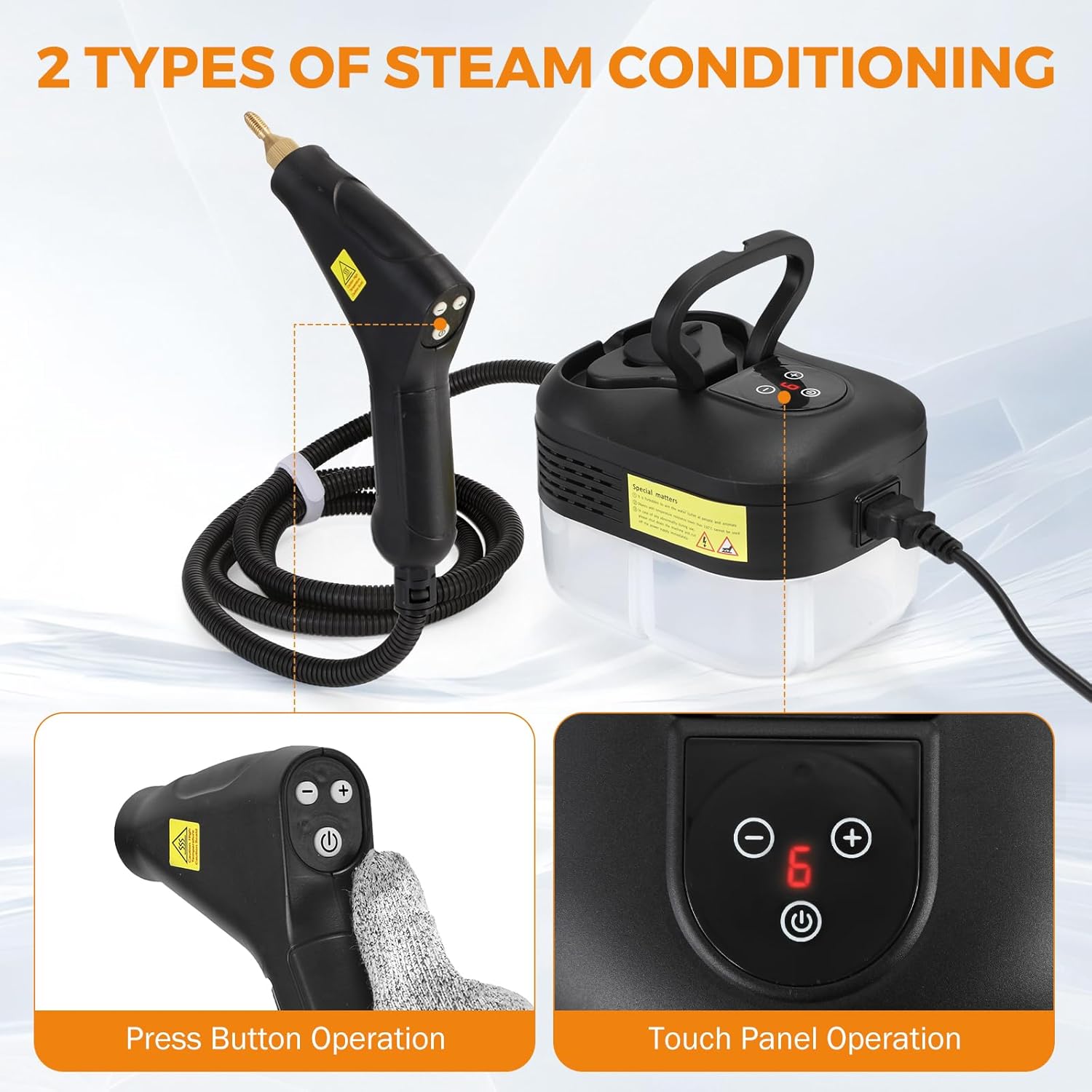 - **Easy Operation: Just fill the 1.2L (41oz) water container, turn on the switch, and control steam output via touch panel or steam gun button. Features an LED digital display for precise control.