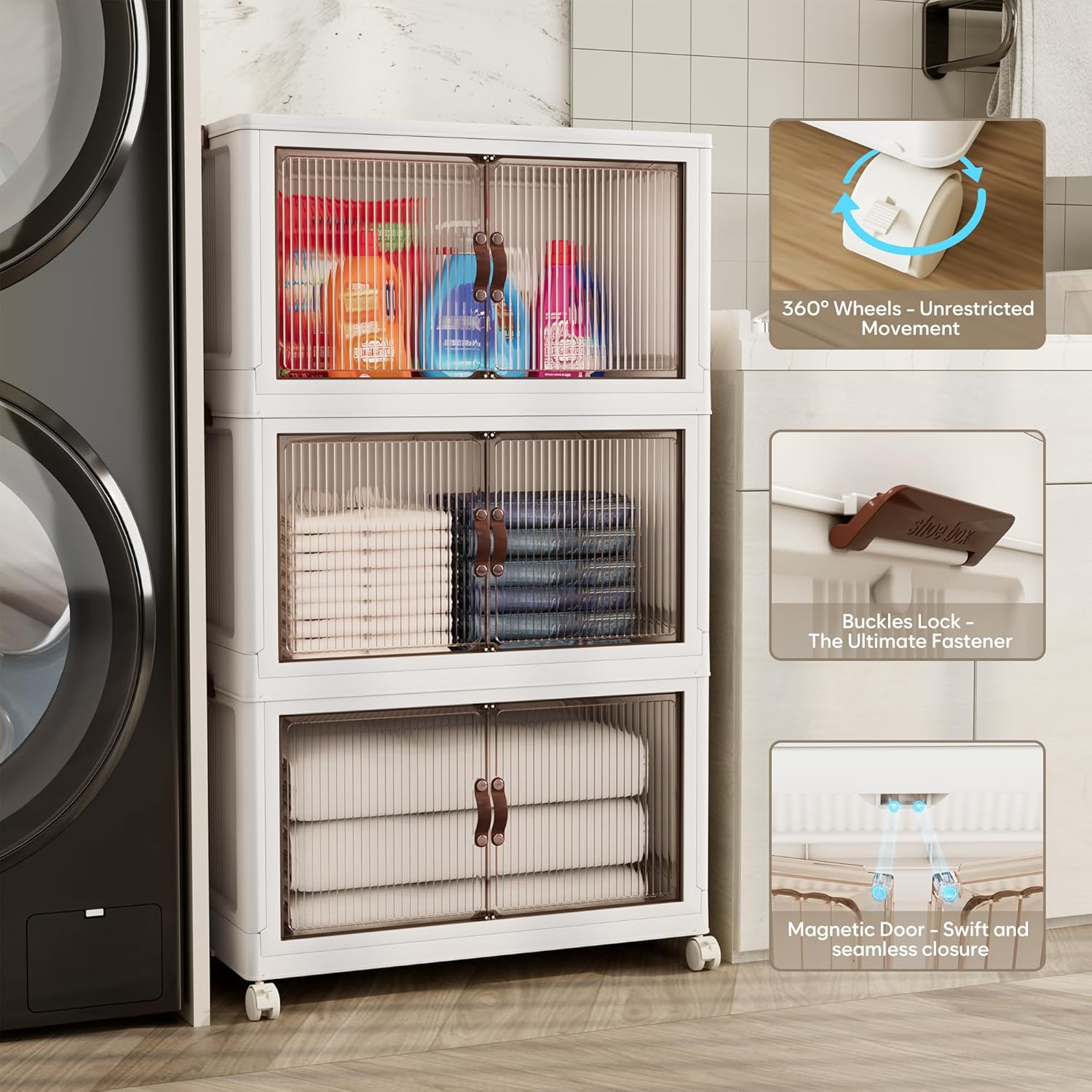 Jalove 88QT Plastic Storage Bins with lids, Stackable Collapsible Storage Containers with Wheels, Closet Organizer and Storage Drawers, Clothes Storage Cabinet for Home Office Garage, 3 Pack White