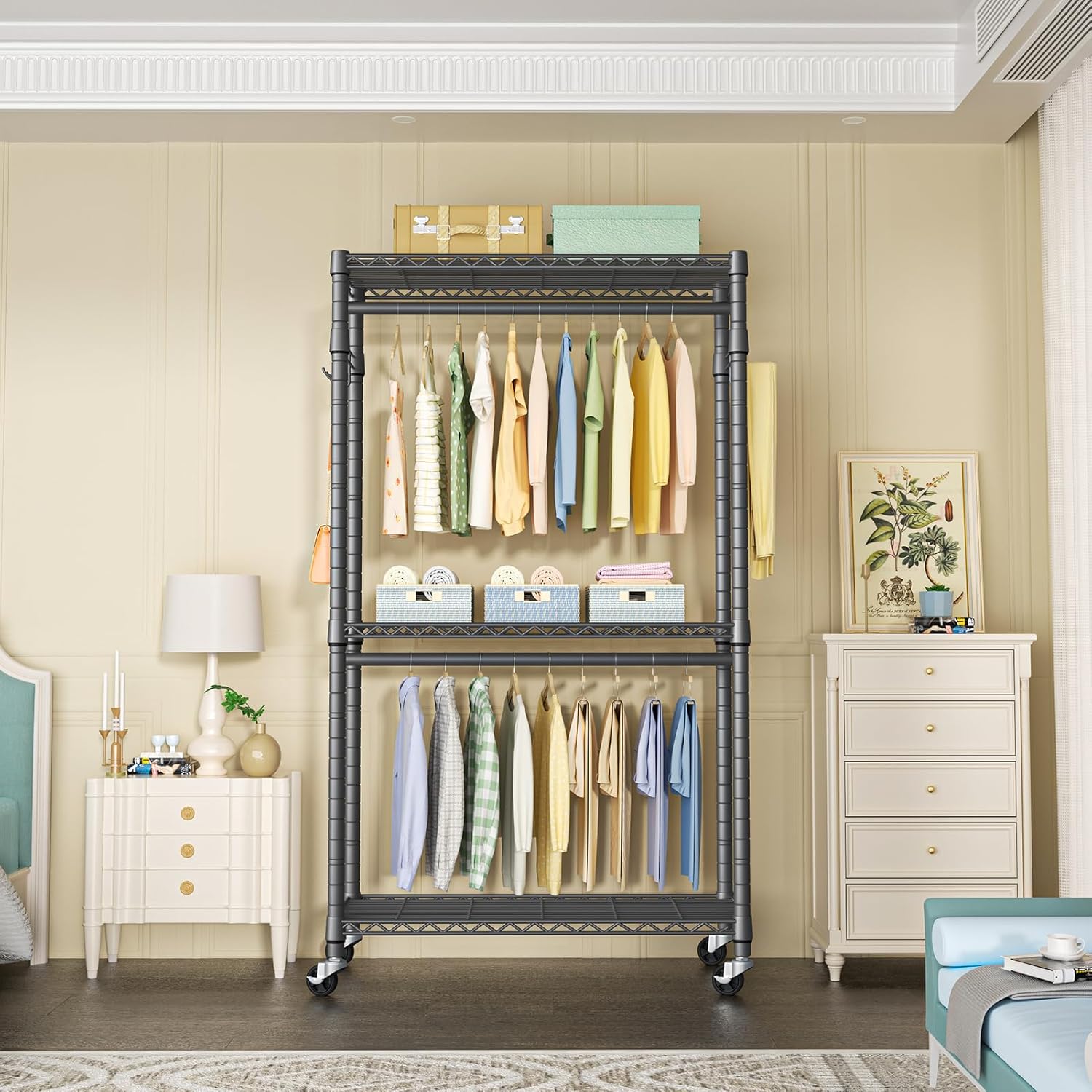 - [Multifunctional Space Saver]: 3 adjustable wire shelves and 2 metal hanger rods offer a 450 pounds storage space for most of the clothes. It’s suitable to place in the bedroom, laundry room, cloakroom, garage, living room, and other places you want