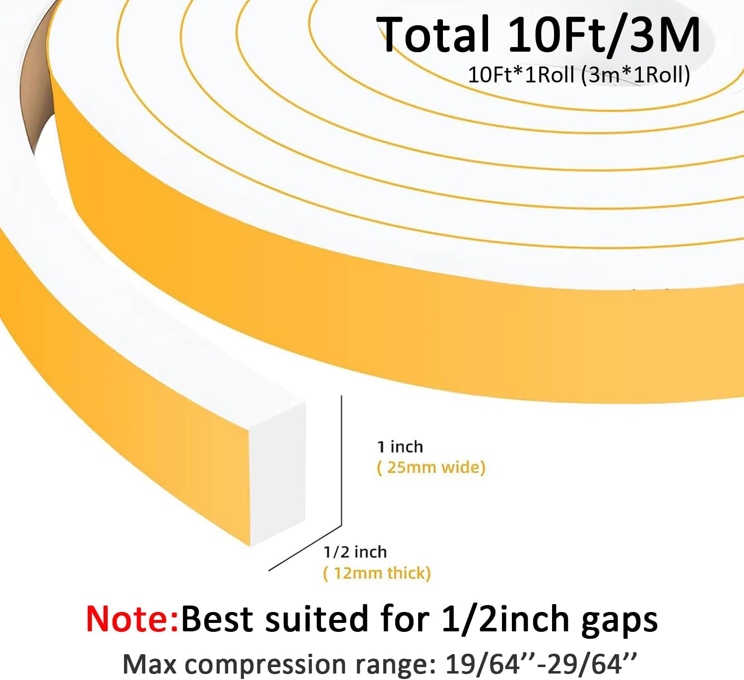 Upgraded Strong Adhesive Foam Weather Stripping Door Seal Insulation Tape for Insulating Door,Window, Air Conditioner Noise-Reduction Self Adhesive Sealing Weatherstrip (1 in x 1/2 in x 10 Ft)