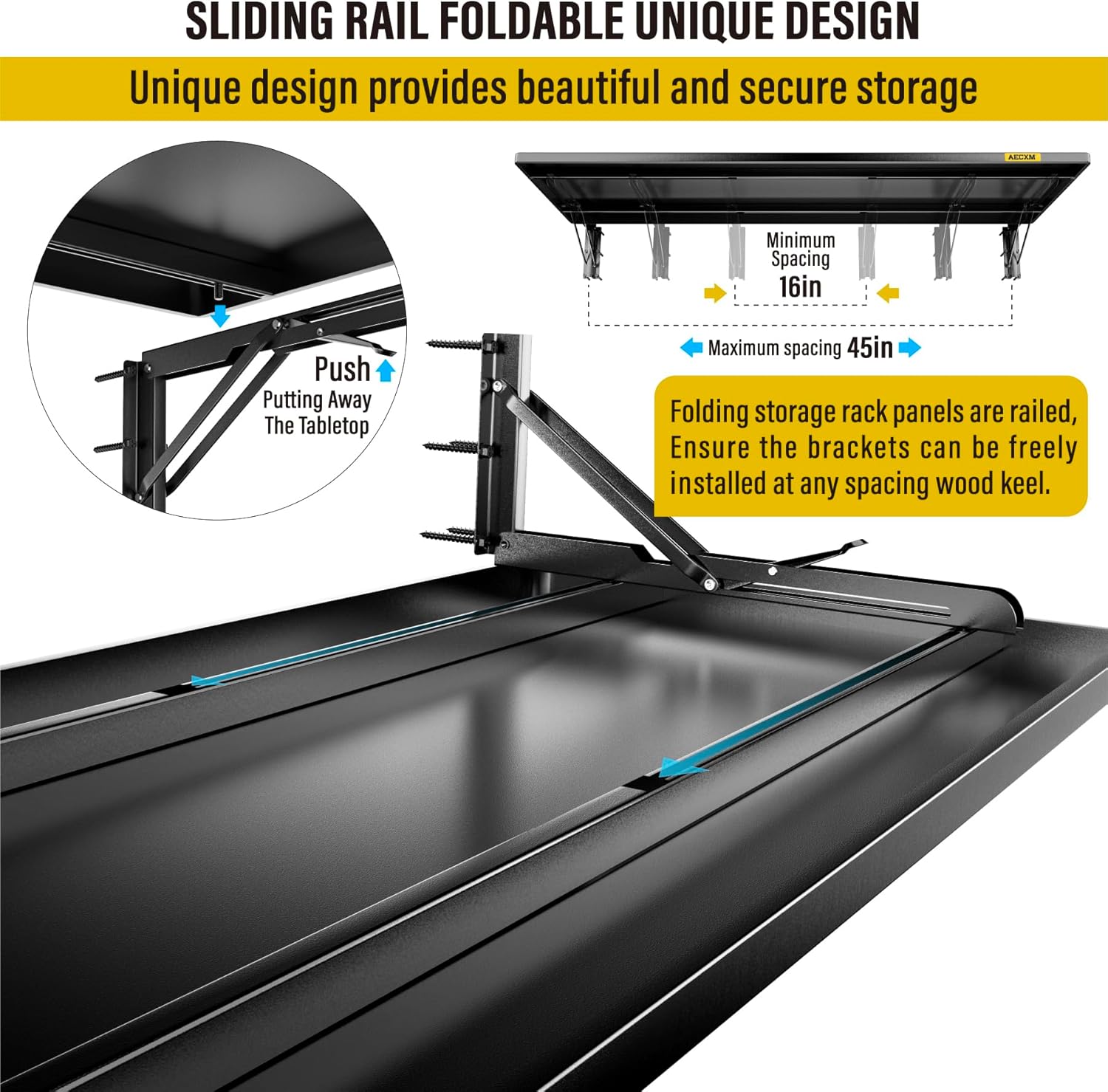 - SUPERIOR DESIGN: The foldable garage storage shelf panel is made of whole steel plate, The surface of matte high temperature powder baking paint, Flat and smooth, Panel with sliding rail design, The bracket can be installed freely in the range of 12"-45" spacing of wood wall keel, And at the same time it adopts folding bracket, Which can be freely stowed away or unfolded.