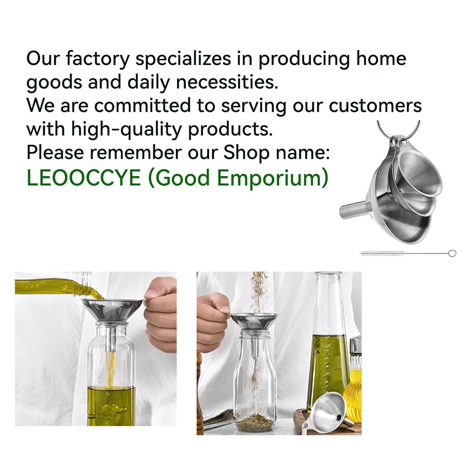 - They do not take up space, are easy to store and clean, and can be washed in a dishwasher or with the included long-handled brush. They are very convenient to use. The three funnels are strung together with a ring and can be stacked together or hung in a suitable place, only taking up a small amount of space.