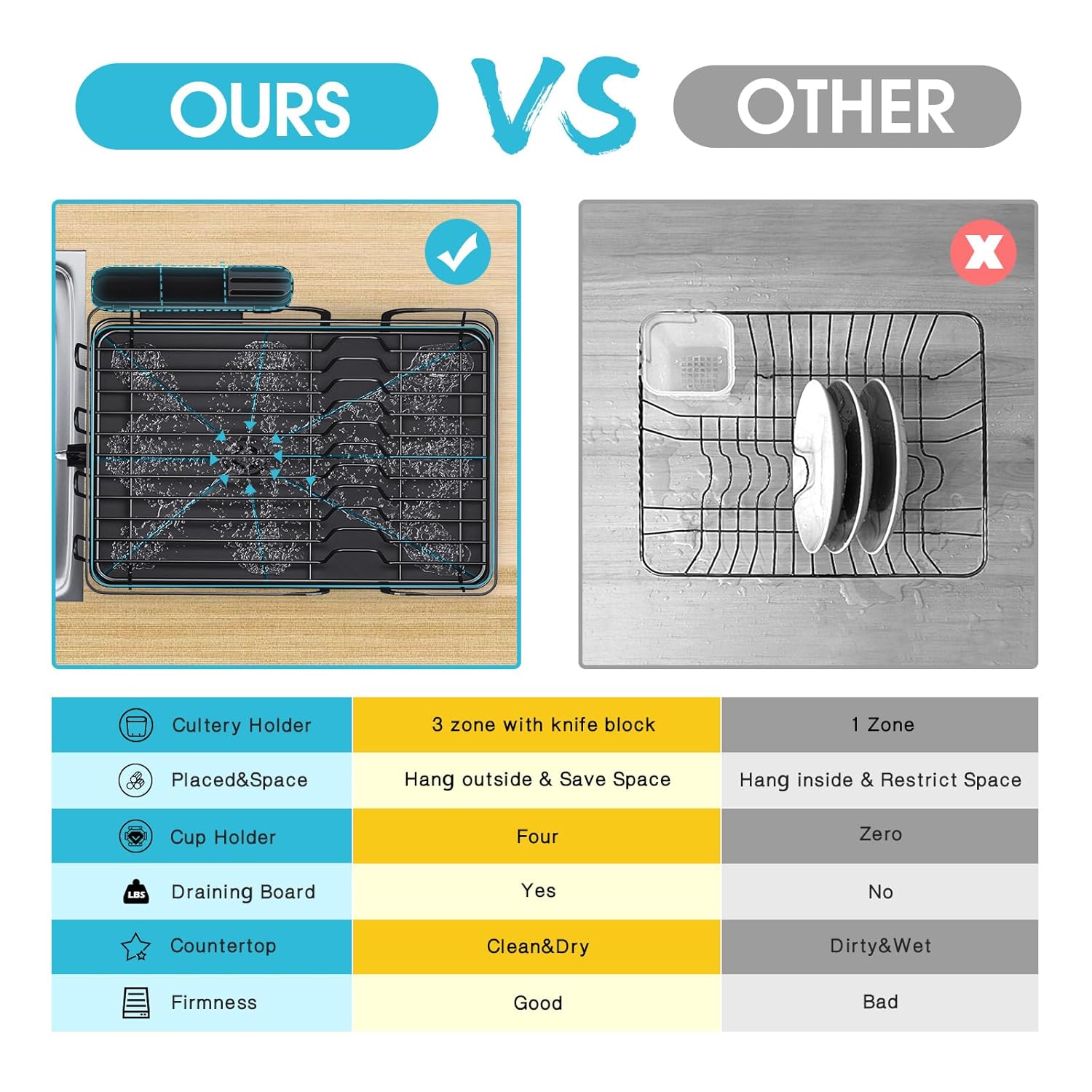 - 【Multifunctional Cutlery Holder Save More Space】Dish rack with hanging cutlery holder has a protruding drain outlet that can guide water to the drainage plate, saving more space. The cutlery holder has 3 compartments to provide dedicated space for your forks, knives and spoons, keeping your cutlery organized