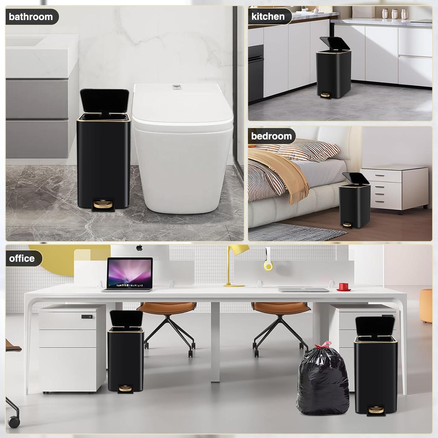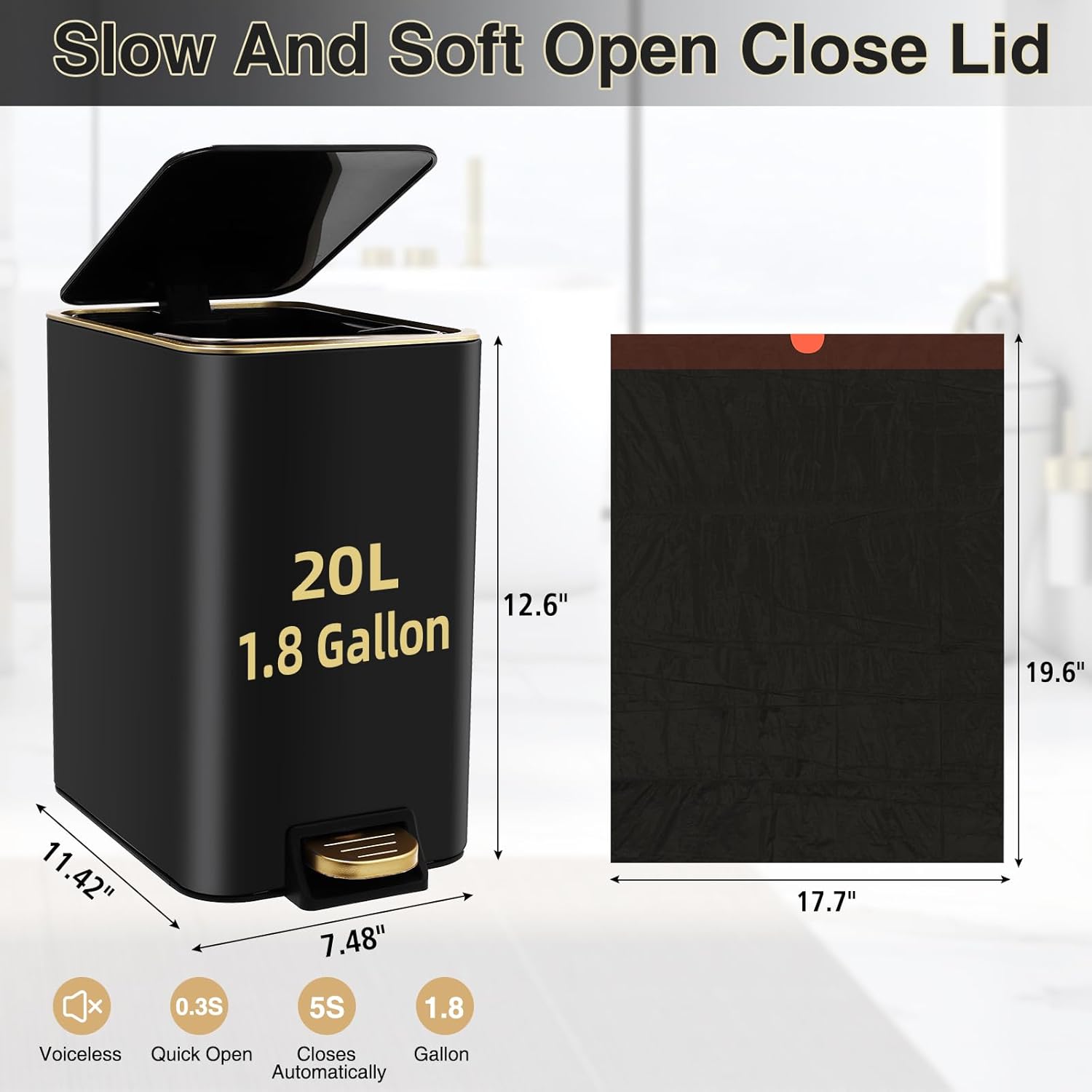 - [Package Included]:Trash can,80 Count 5 Gallon Trash Bag,6 Waterproof Tags. each accessory is carefully selected to meet your daily needs.Our black and gold bathroom set is not only practical but also beautiful, making your bathroom space more neat and comfortable