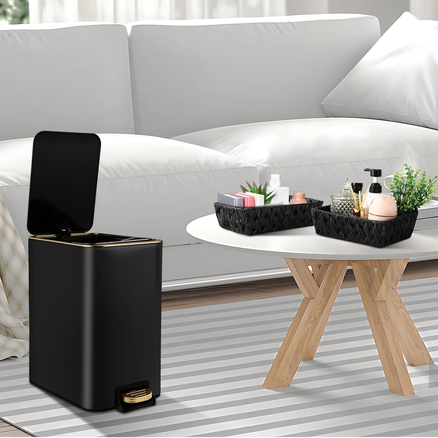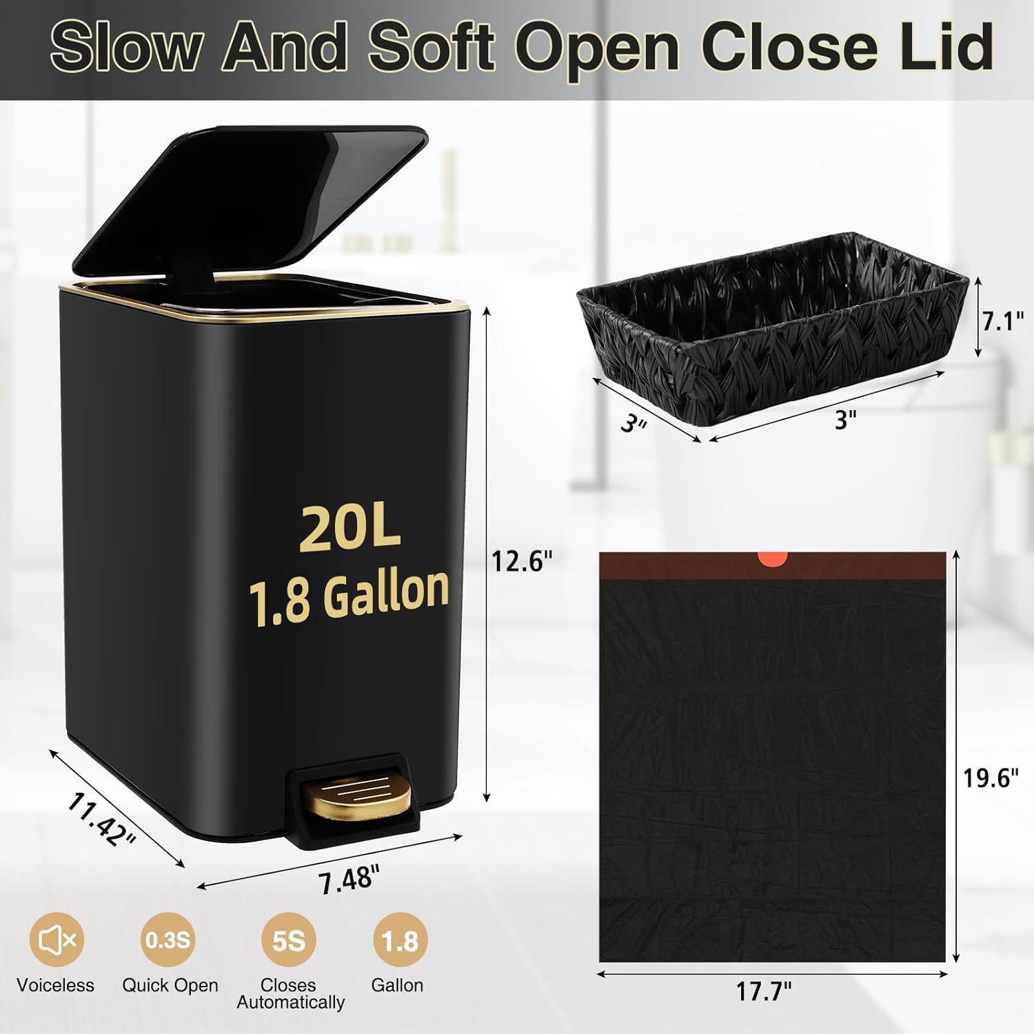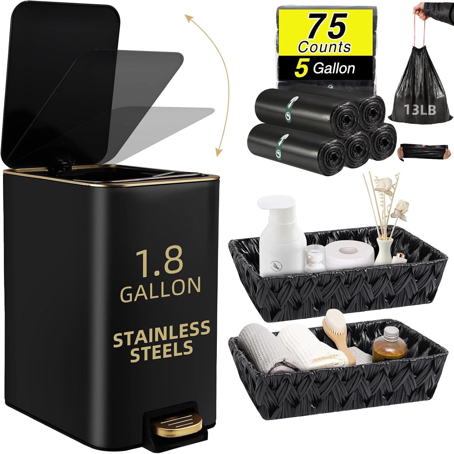 - [Package Included]:Trash can,Wicker Storage Baskets,75 Count 5 Gallon Trash Bag,6 Waterproof Tags. each accessory is carefully selected to meet your daily needs.Our black and gold bathroom set is not only practical but also beautiful, making your bathroom space more neat and comfortable