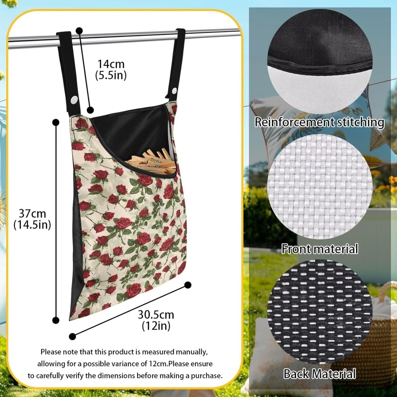 Rose Clothespin Bag Fashion Hanging Storage Organizer Clothes Pin Bag Waterproof Laundry Clothespin Bag Clothespin Holder with Hanger Hook for Easy Hang and Large Opening